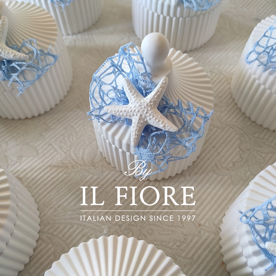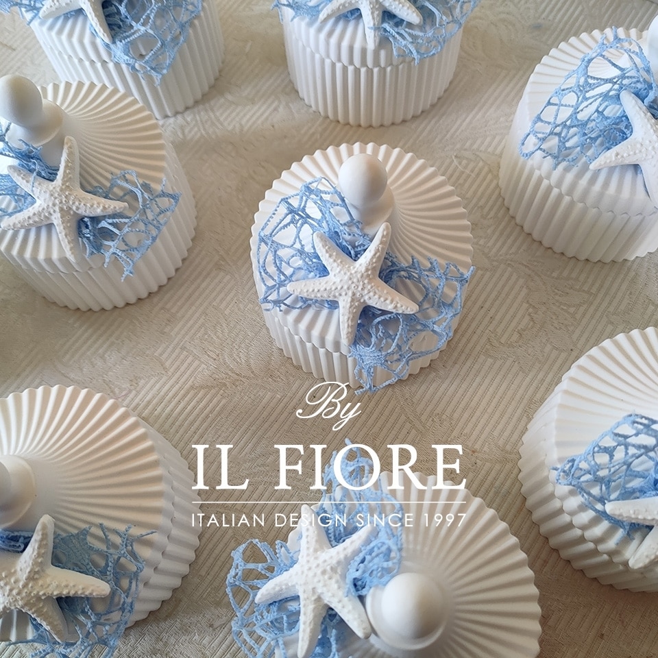 Bomboniera Matrimonio, scatola in gesso con candela, decorata con stella Marina e fiocco.