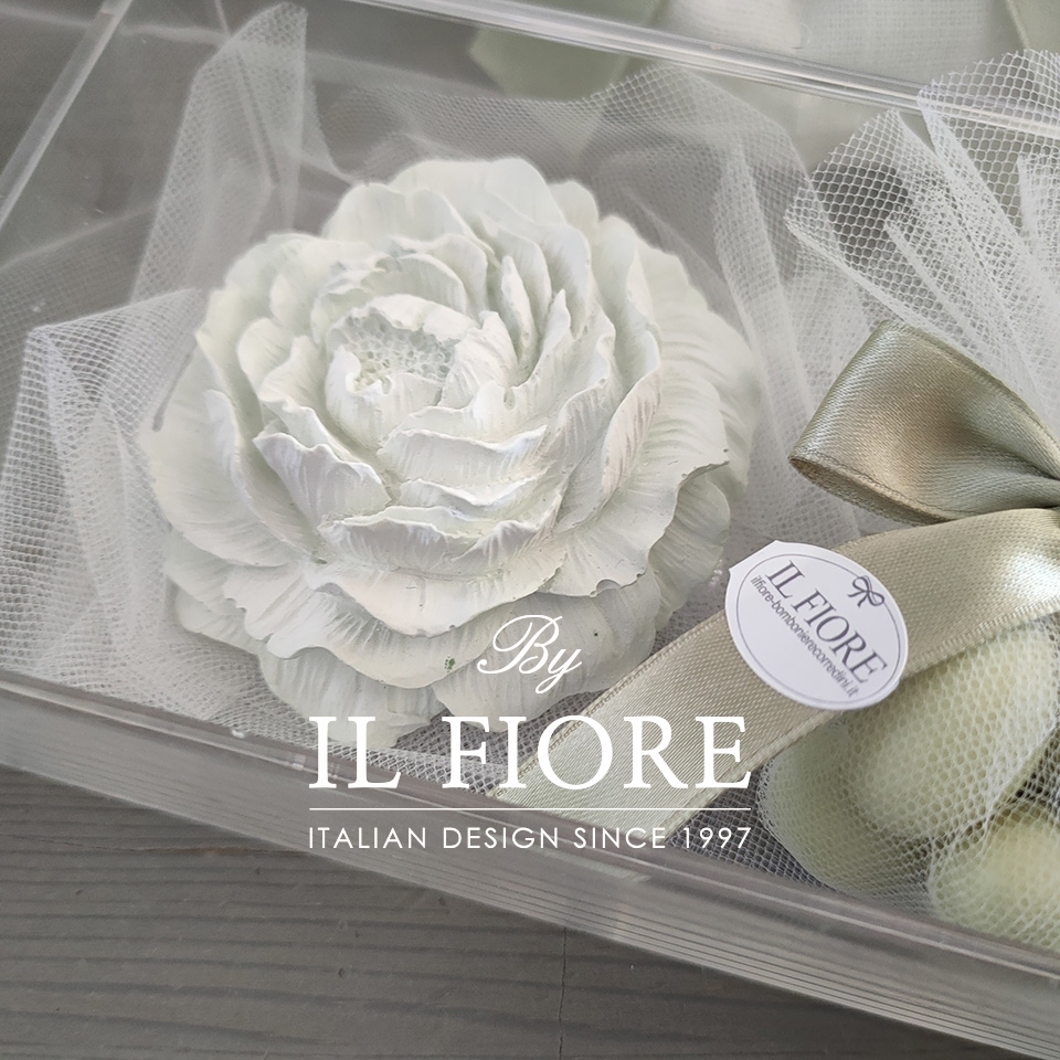 Bomboniera peonia in gesso verde salvia per matrimonio, Comunione, Cresima e anniversario matrimonio.