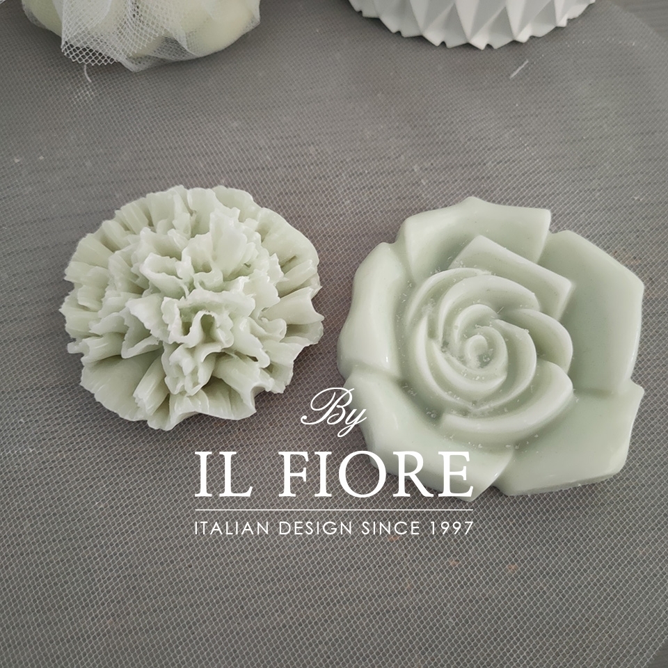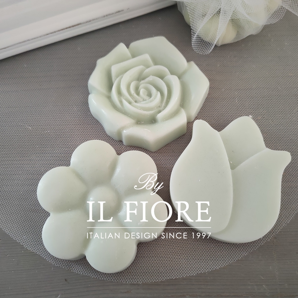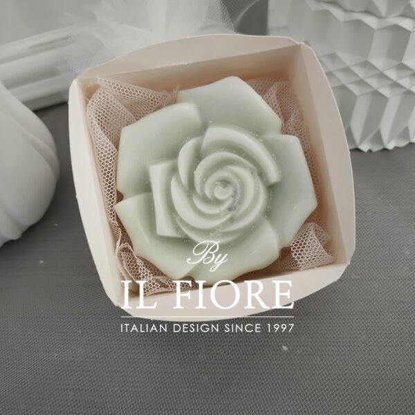 La bomboniera ha 4 quattro forme rosa, margherita, tulipano e fiore. le candele sono confezionate con scatola, fiocco e tulle.