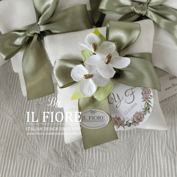 Bomboniera Matrimonio. Il sacchetto busta portaconfetti è decorata con fiori ortensie e tag personalizzabile.