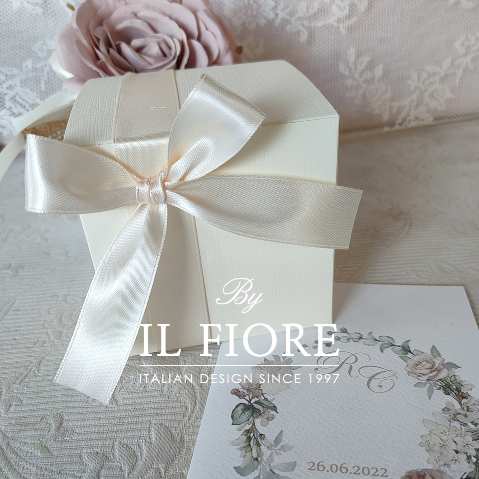 La bomboniera è confezionata con scatola, confetti e nastro.