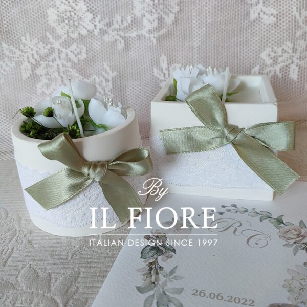 Bomboniera Matrimonio e anniversario di matrimonio. Bomboniera candela con fiori in vasetti di gesso quadrata e tonda che possono essere utilizzati come portaoggetti a candela finita, decorati con pizzo e nastro.