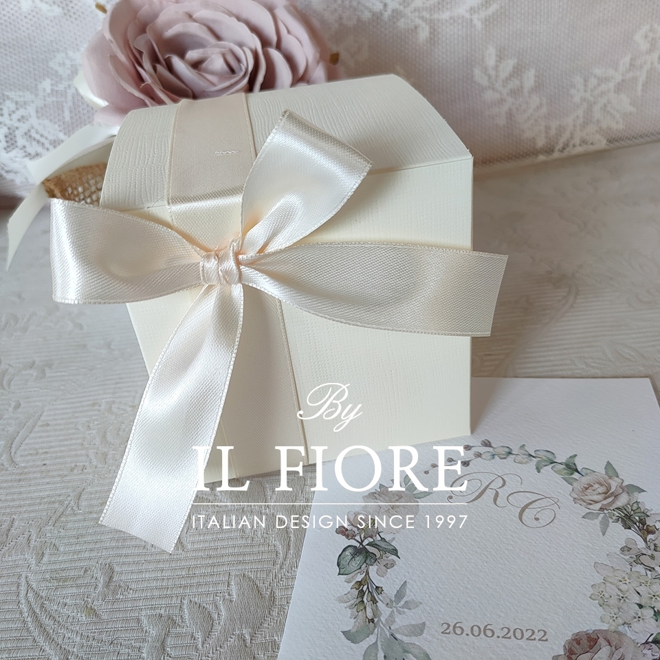 La bomboniera è confezionata con scatola, confetti e nastro di raso.