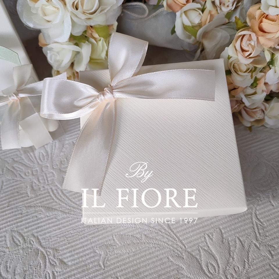 La bomboniera è confezionata con scatola, confetti e nastro.