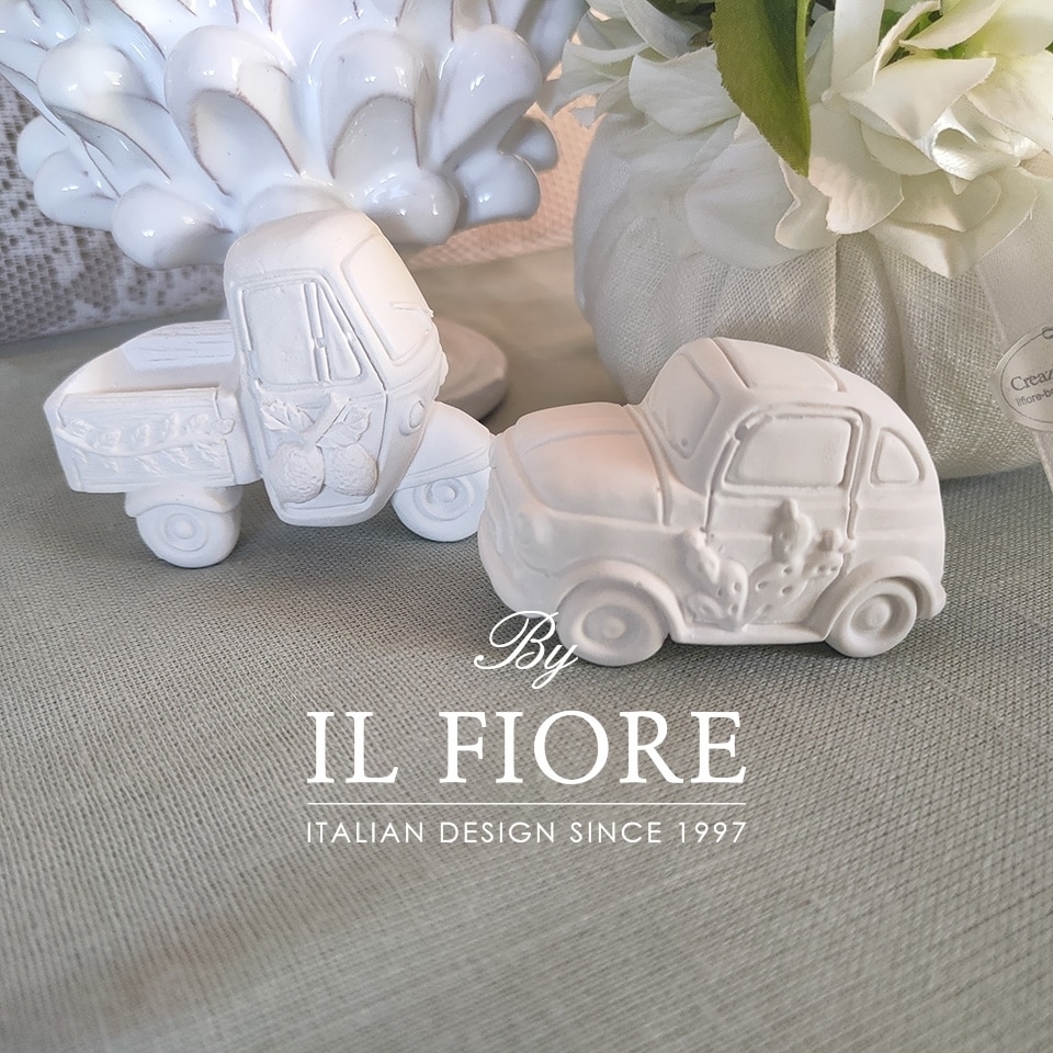 Bomboniera matrimonio, cinquecento e ape siciliana in gesso profumato con calamita, confezione con scatola, tag con nomi sposi e data cerimonia e fiocco.