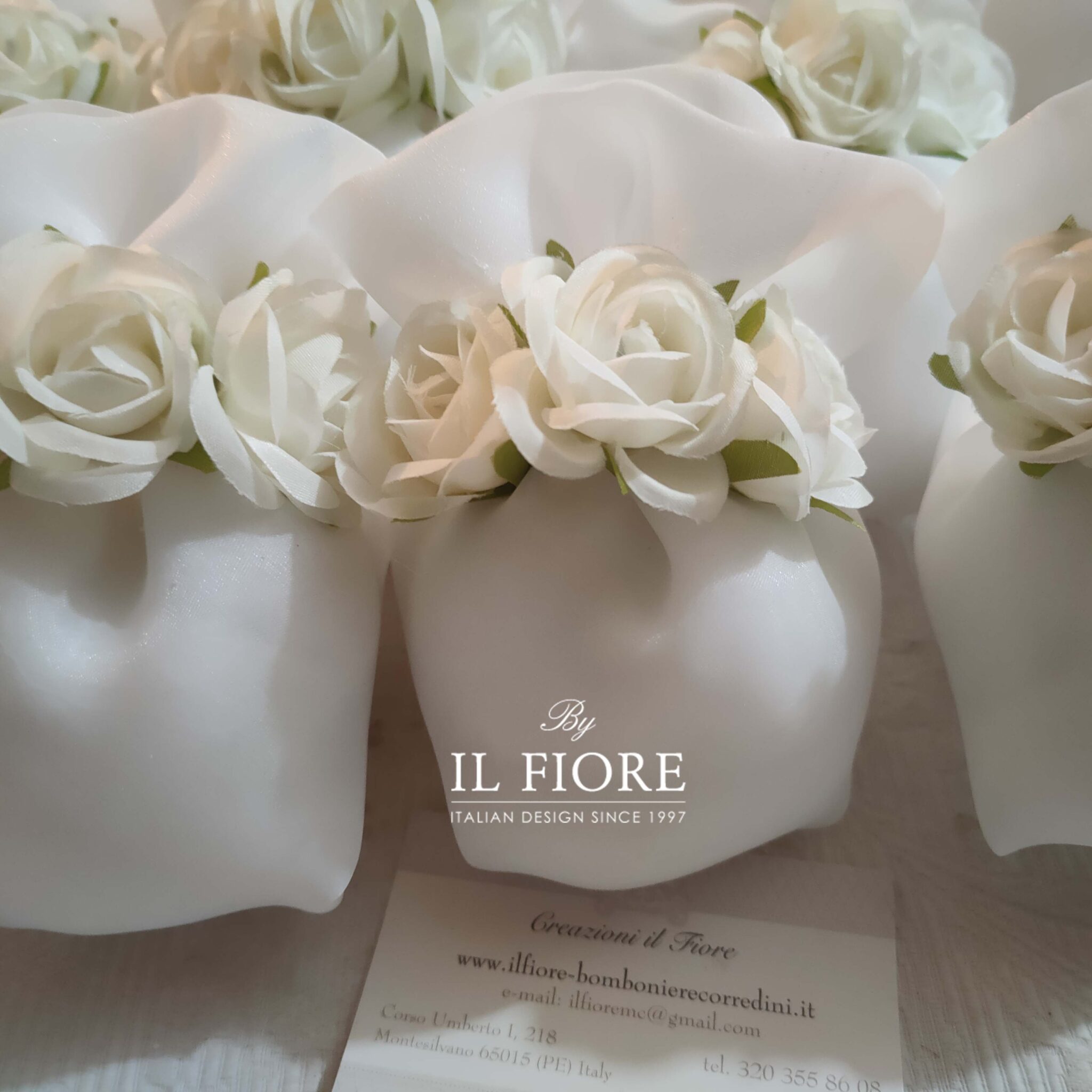 Bomboniera Matrimonio, Comunione, Cresima e anniversario matrimonio, raffinato sacchetto in organza decorato con romantici fiori.