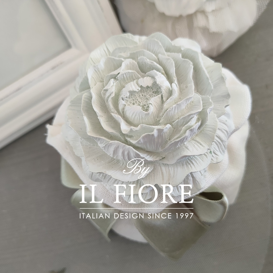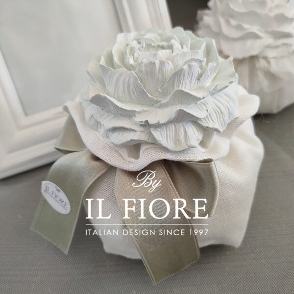 Bomboniera Matrimonio, Comunione, Cresima e anniversario matrimonio, sacchetto in lino colore bianco con peonia e nastro in raso di colore verde salvia. La bomboniera è realizzata con peonia in gesso profumato di colore verde salvia e bianco, Confezione scatola con 5 confetti alla mandorla classica e nastro di raso. Misura cm 13. Il colore del nastro si può cambiare.