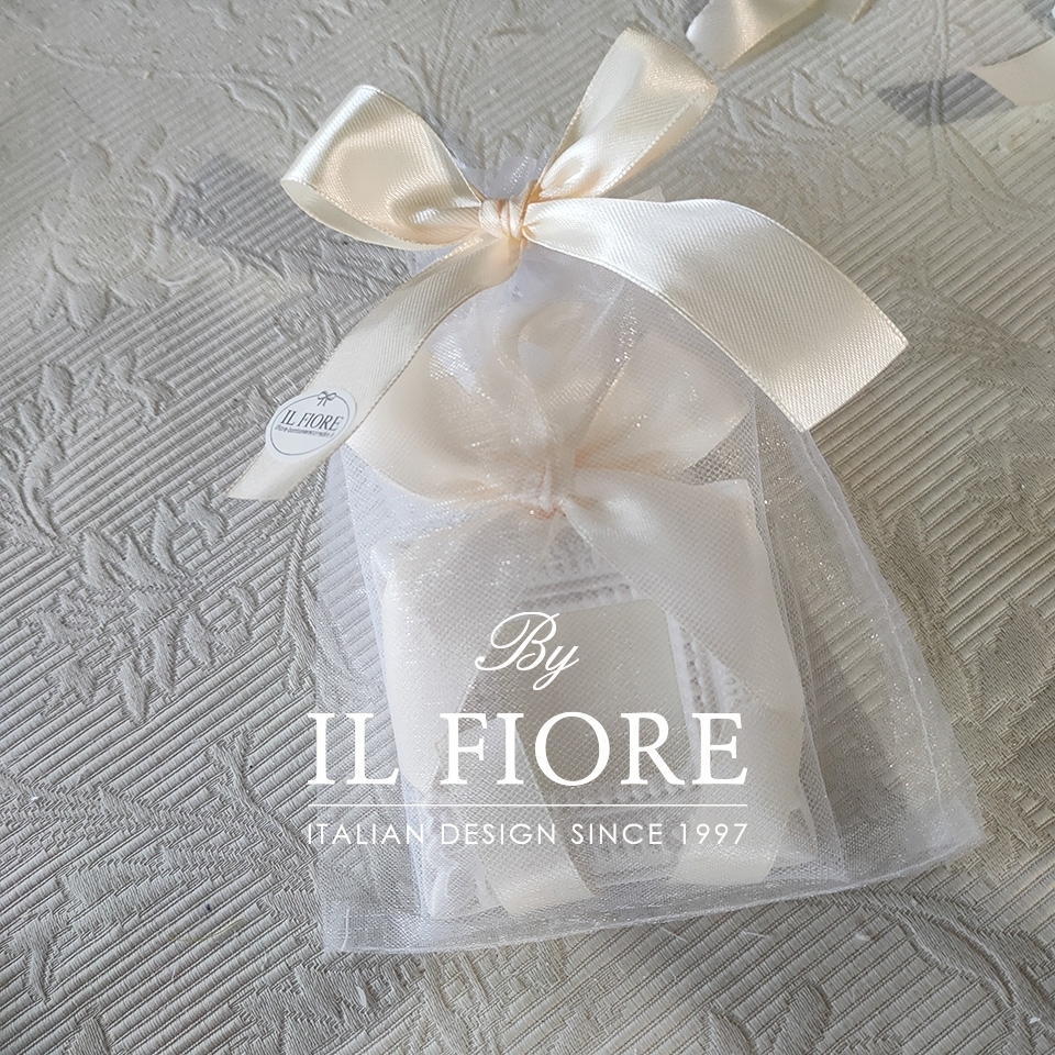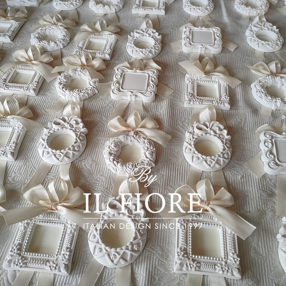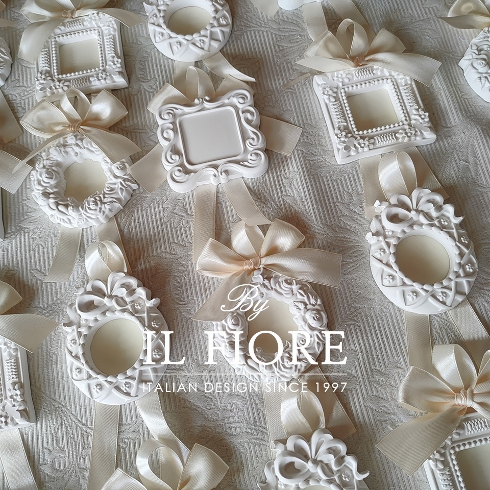 Bomboniera matrimonio cornici i n gesso profumato, la bomboniera è confezionata con sacchetto in organza e tulle.