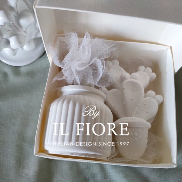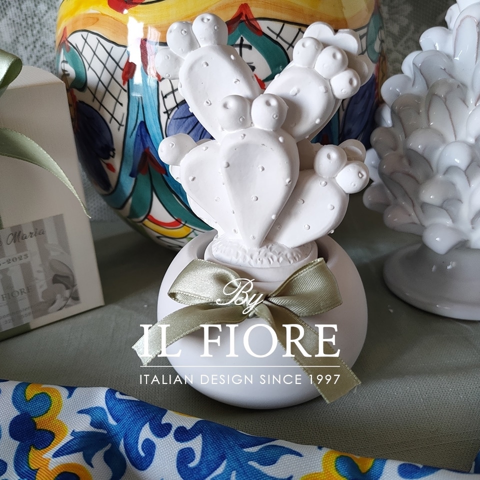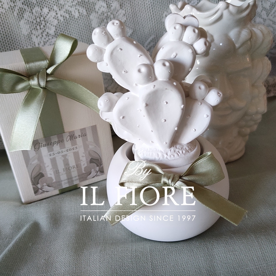 Bomboniera Matrimonio. Bomboniera profumatore fico d’india siciliano in gesso profumato. La bomboniera รจ confezionata con scatola decorata con tag e nastro.