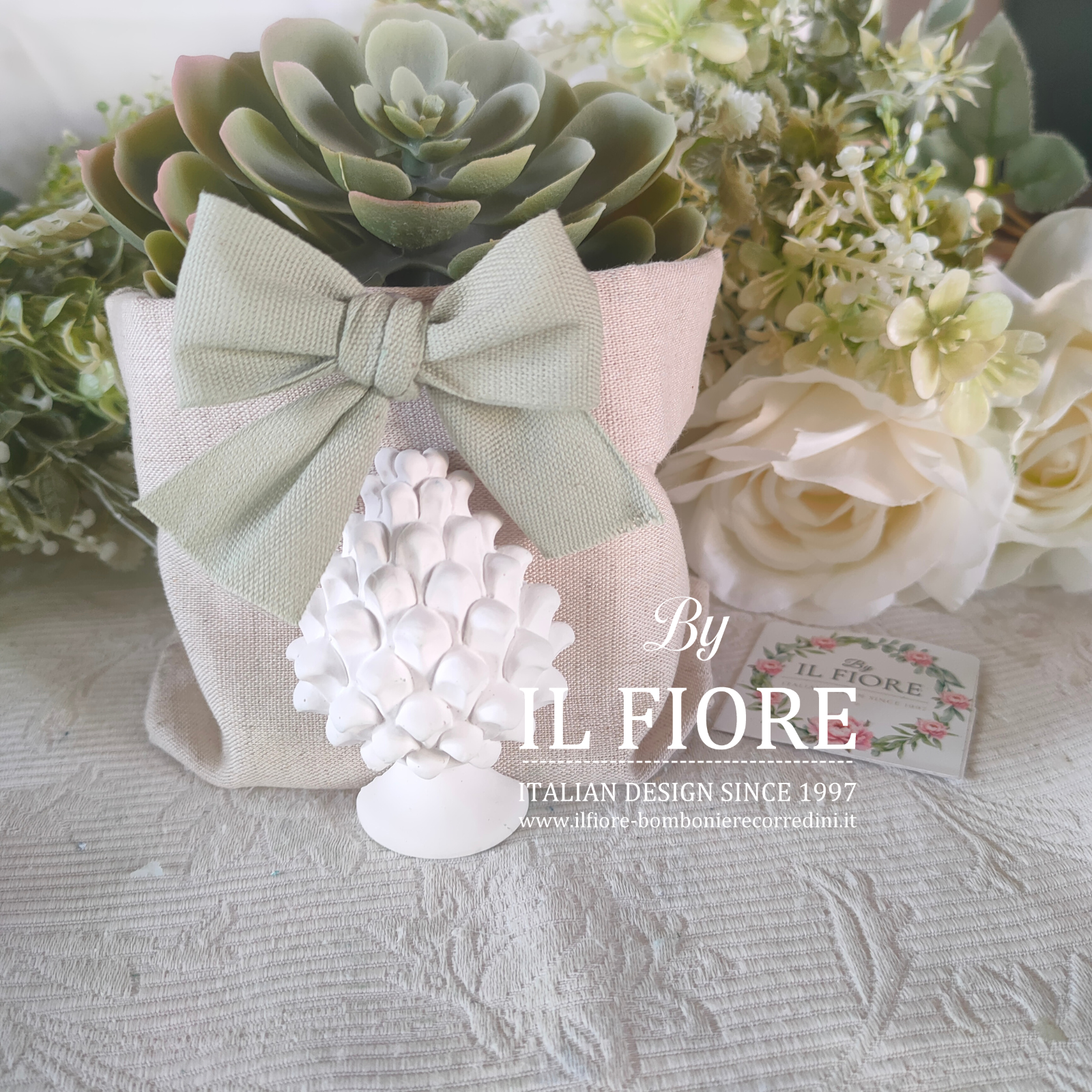 La bomboniera è confezionata con sacchetto ecru decorata con pigna siciliana bianca.