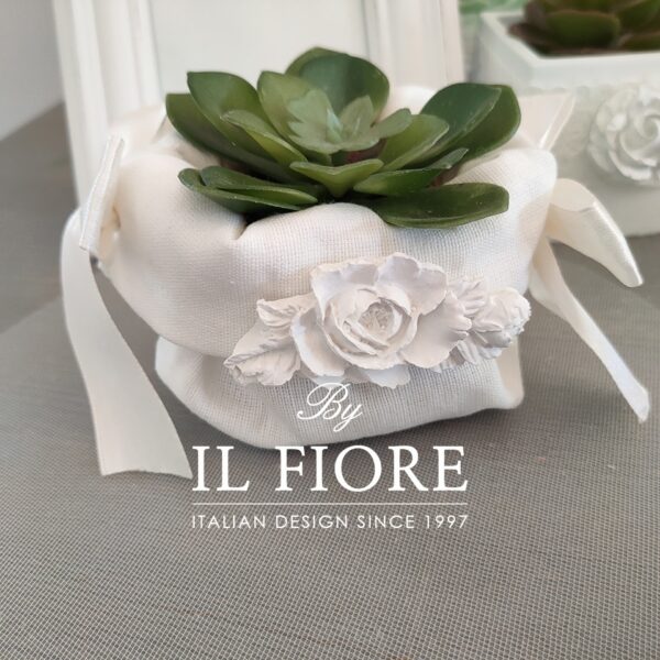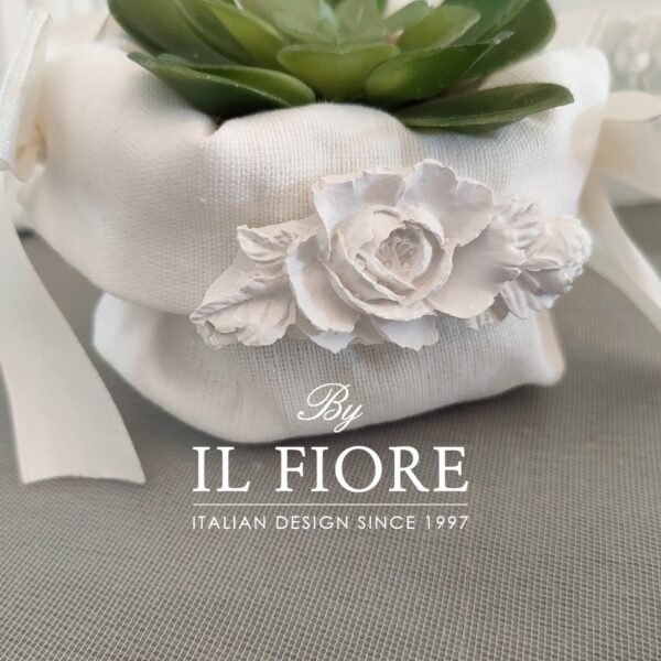 La bomboniera è confezionata con sacchetto decorato con peonia in gesso profumato. La bomboniera green piantine grasse sono tutte confezionate con ottimi materiali made in Italy.