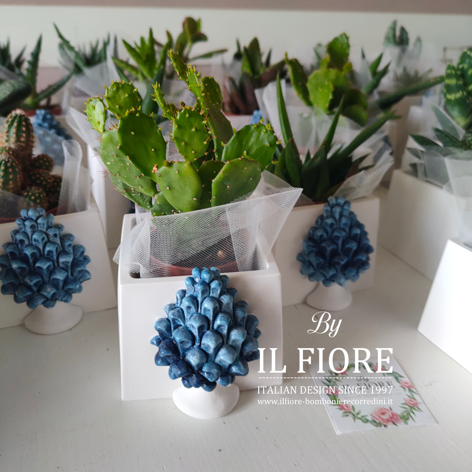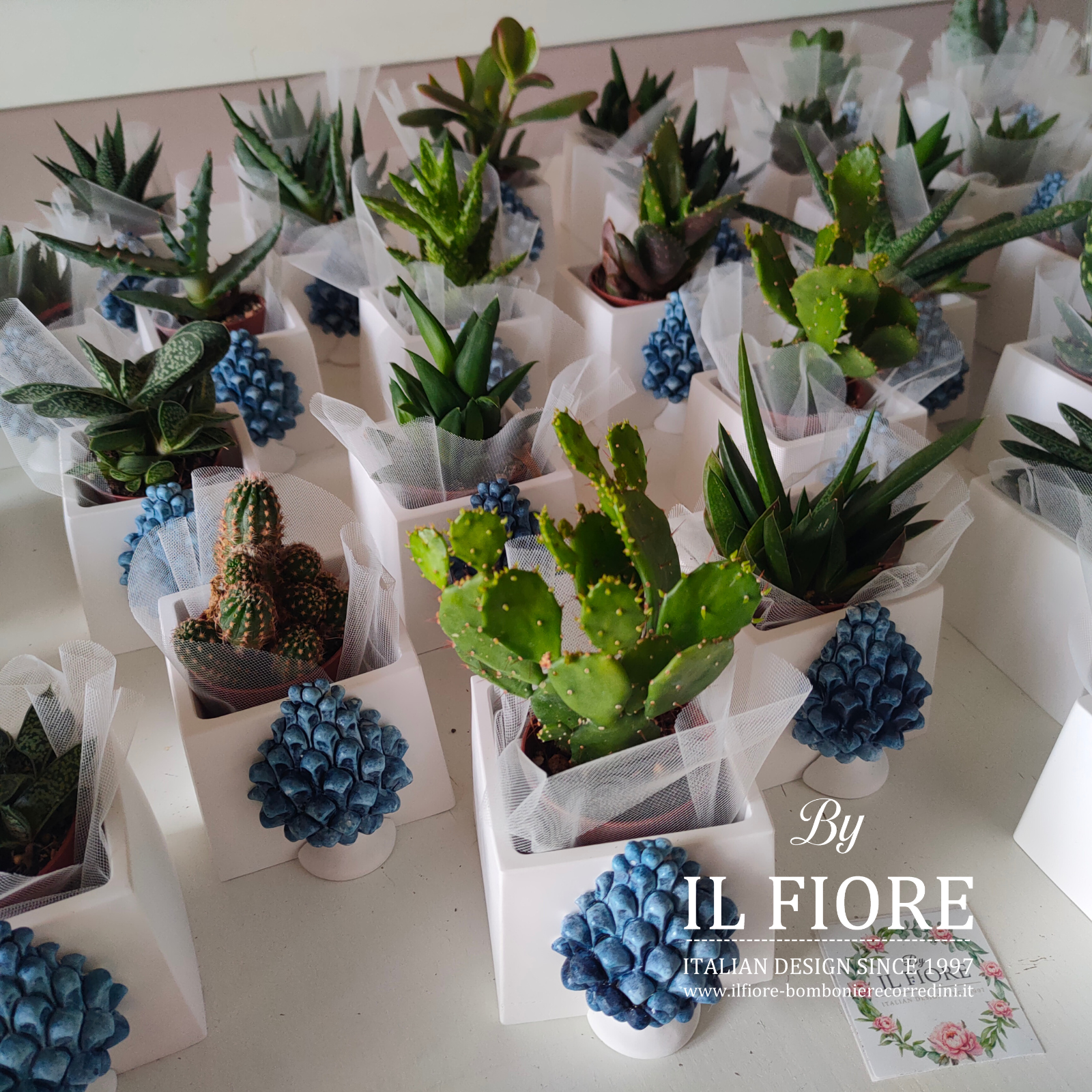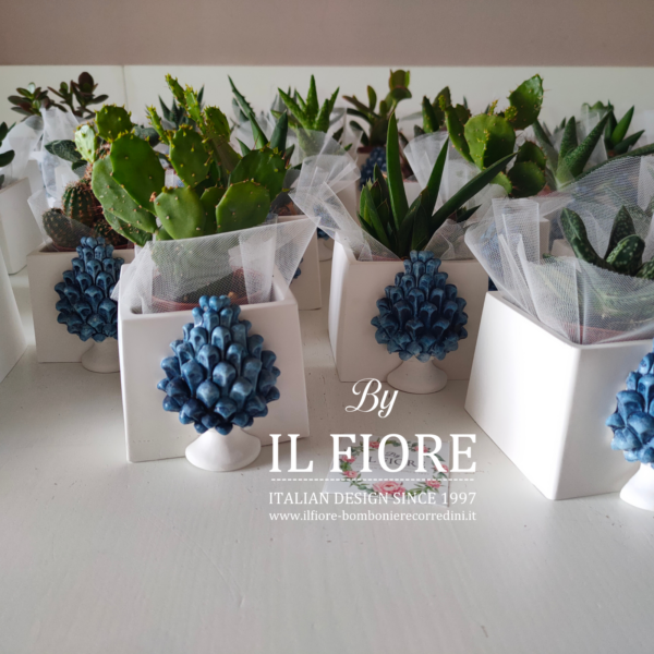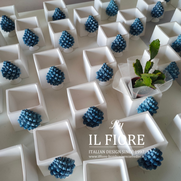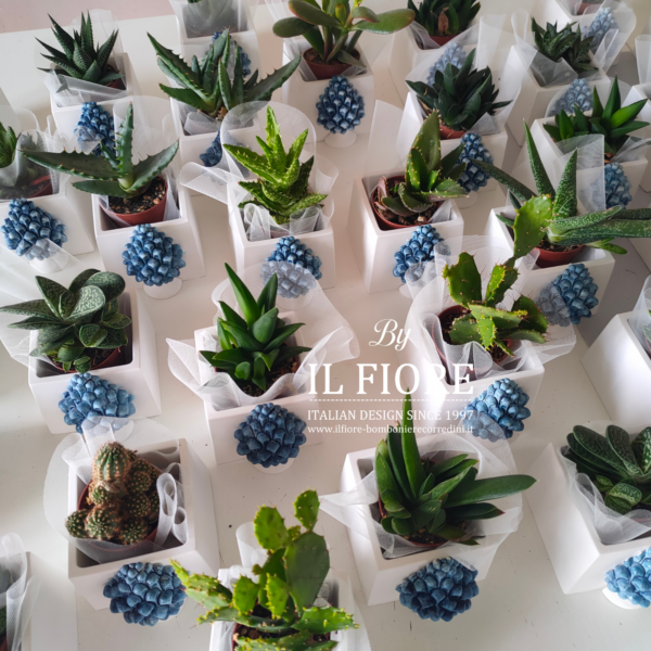 Bomboniera matrimonio. Bomboniera con piantine grasse VERE e MISTE. La bomboniera รจ confezionata con vasetto in gesso bianco di forma quadrata decorati con pigna BLU.