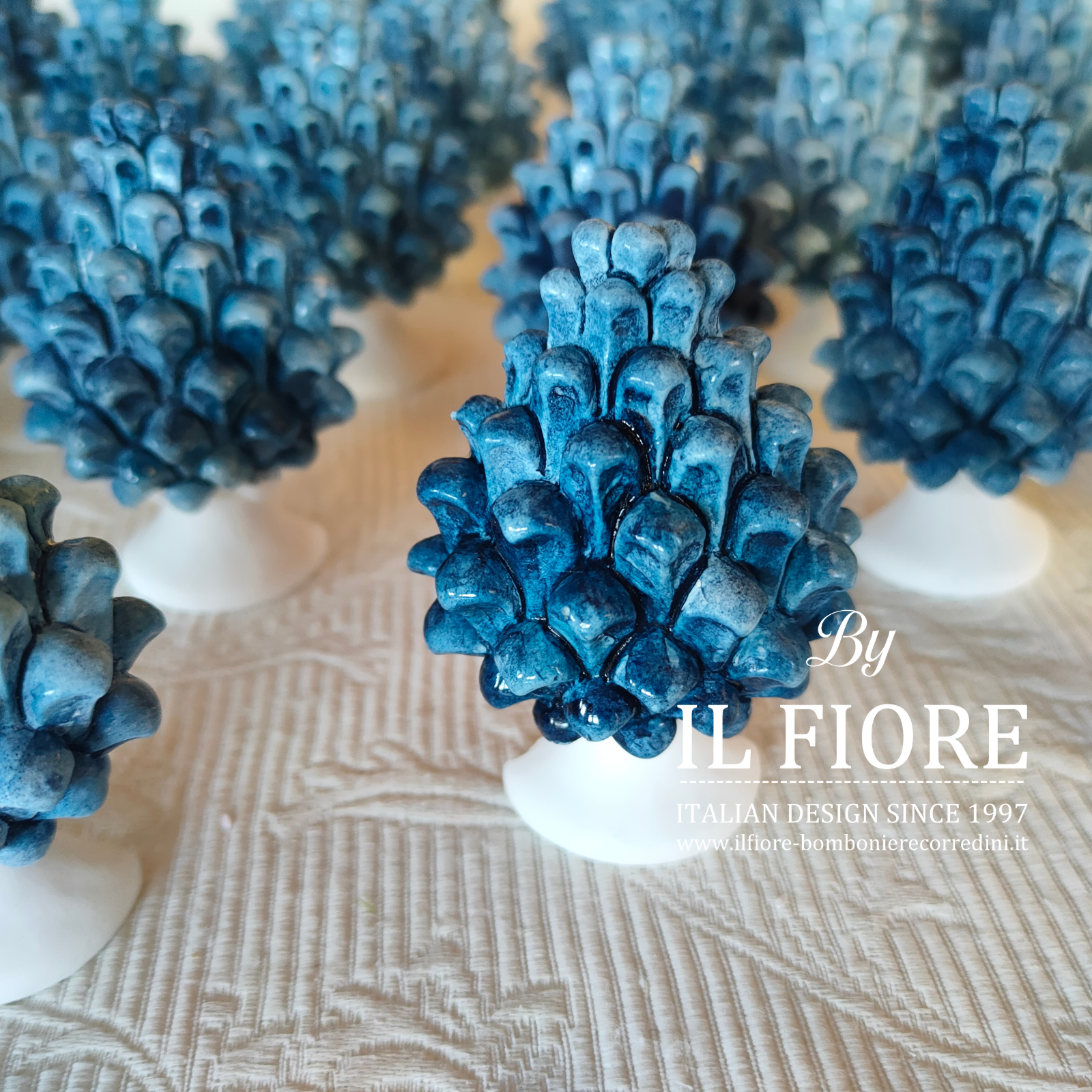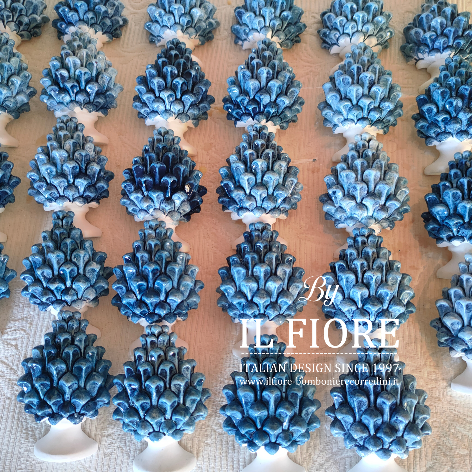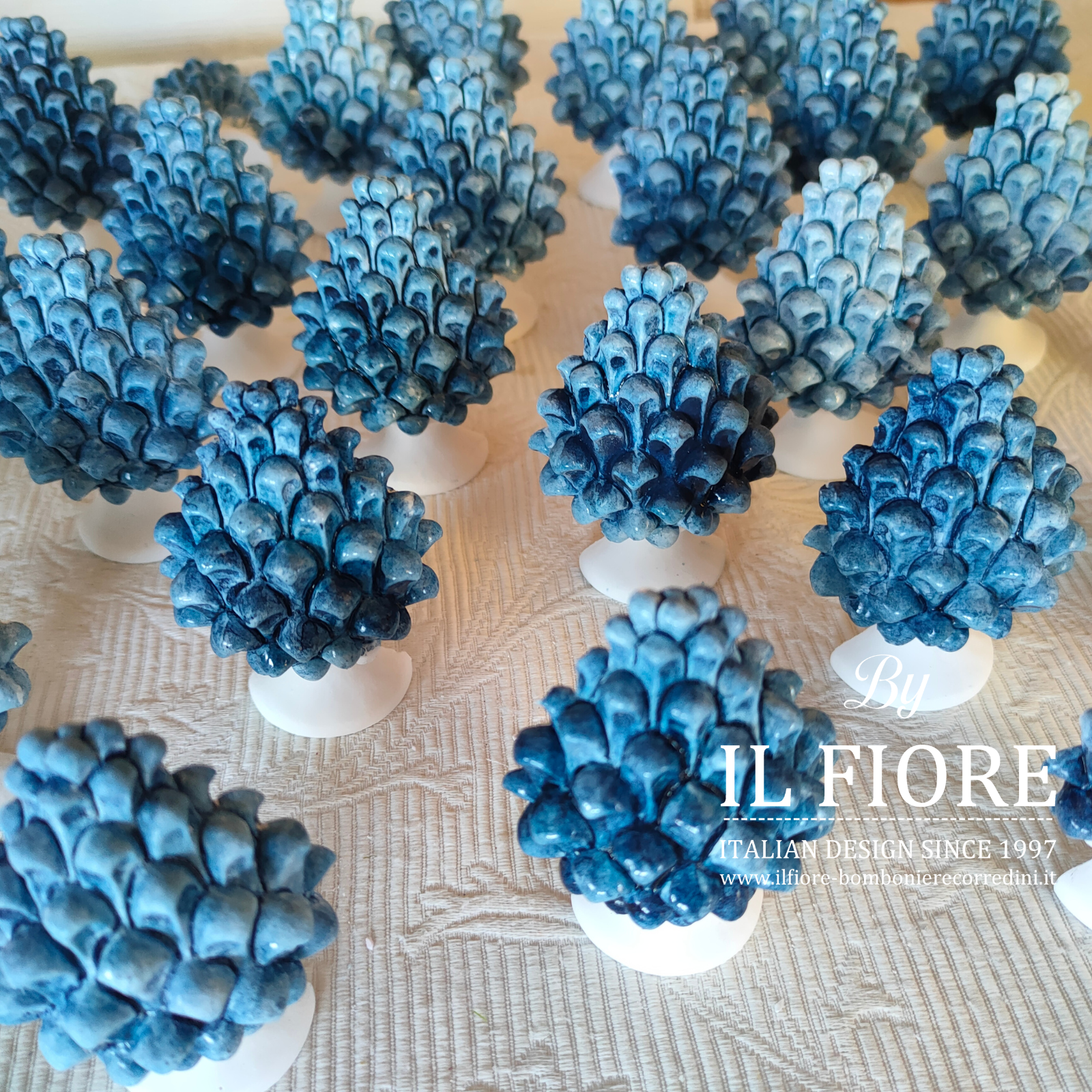 Bomboniera matrimonio. Bomboniera con piantine grasse VERE e MISTE. La bomboniera รจ confezionata con vasetto in gesso bianco di forma quadrata decorati con pigna BLU.