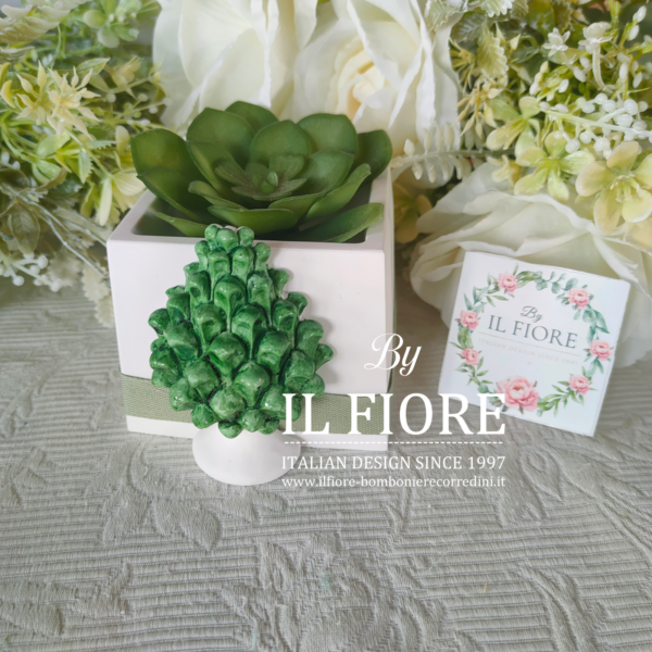 Bomboniera matrimonio. Bomboniera con piantine grasse VERE e MISTE. La bomboniera è confezionata con vasetto in gesso bianco di forma quadrata decorati con pigna SICILIANA VERSE in gesso.