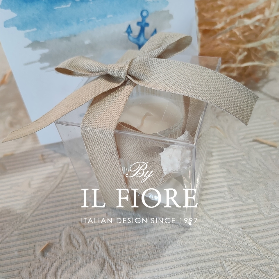Bomboniera Matrimonio e anniversario matrimonio. Bomboniera originale portacandela in vetro con conchiglia in gesso profumato, confezionate con scatola e confetti.