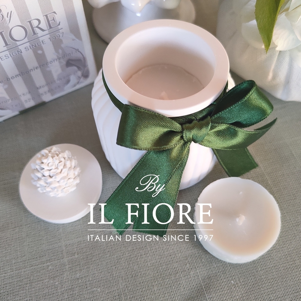 Bomboniera matrimonio, barattolo in gesso con candela. La bomboniera ha due funzioni come portacandele e portaoggetti, decorato con fiocco e pigna.