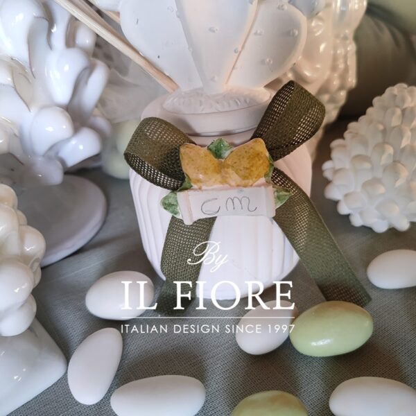 Bomboniera Matrimonio. Bomboniera profumatore fico d’india siciliano in gesso profumato decorata con targhetta limoni personalizzabile con iniziali.