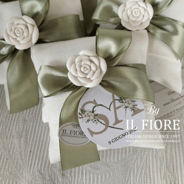 Bomboniera Matrimonio, sacchetto portaconfetti chiuso a busta con rosa, nastro di raso verde salvia e tag personalizzabile.