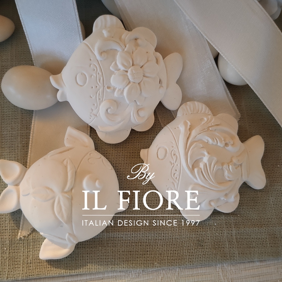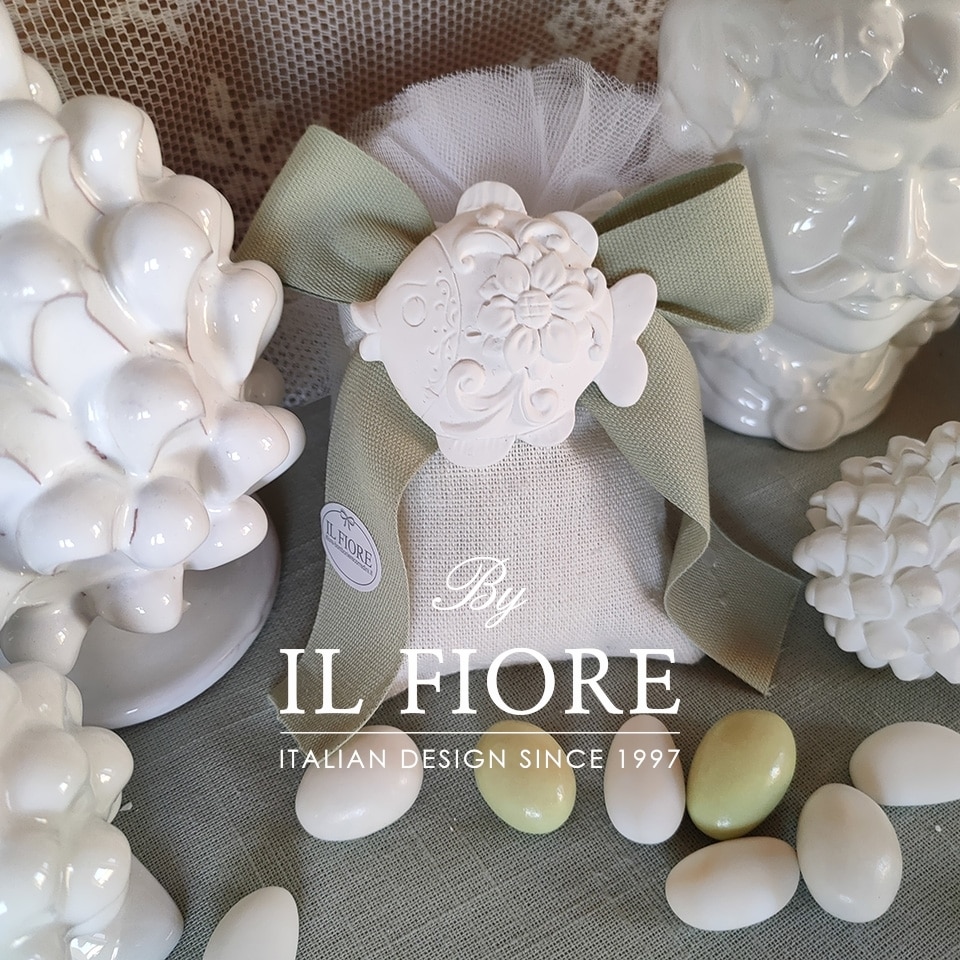 Bomboniera matrimonio, sacchetto con fiocco e pesciolino con decoro siciliane in gesso profumato bianco con calamita.