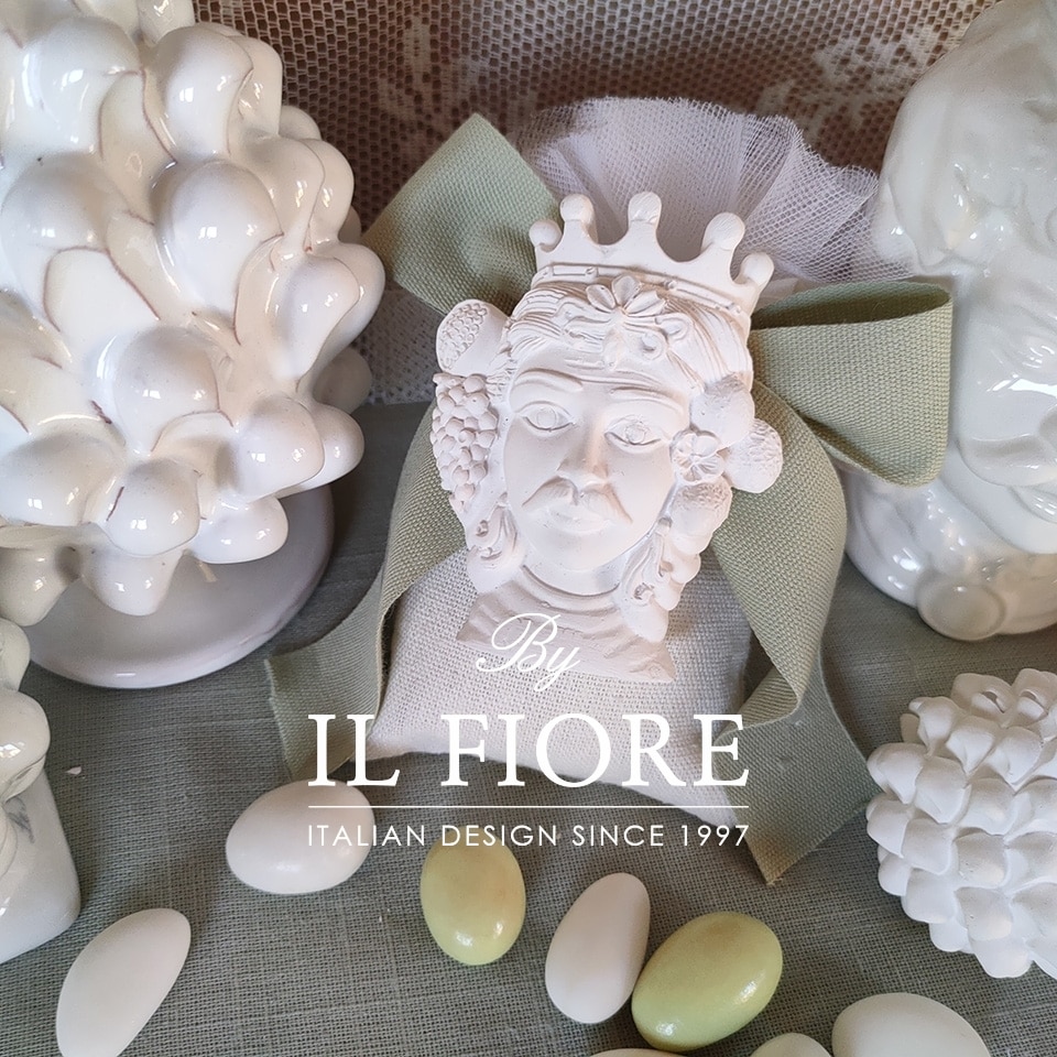 Bomboniera matrimonio, sacchetto con fiocco e teste di moro siciliane in gesso profumato bianco con calamita.