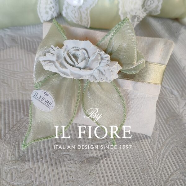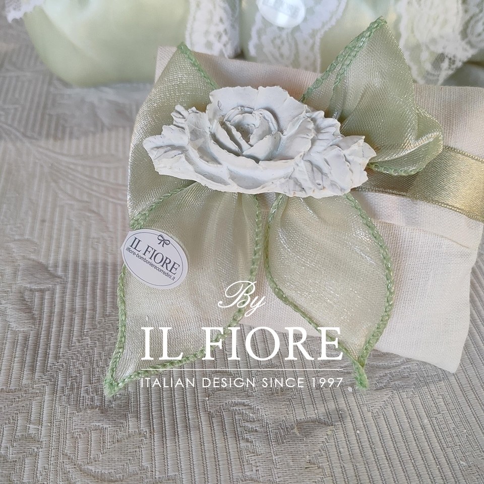 Bomboniera Matrimonio e anniversario matrimonio. Il sacchetto busta portaconfetti è decorata con peonia in gesso profumato di colore salvia chiaro e fiocco.