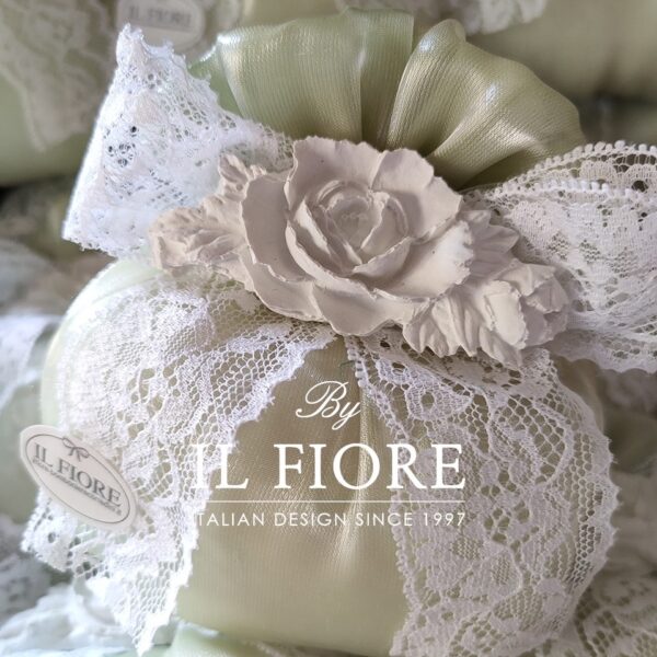 Bomboniera Matrimonio, sacchetto portaconfetti con fiore peonia in gesso di colore verde salvia e nastro in pizzo.