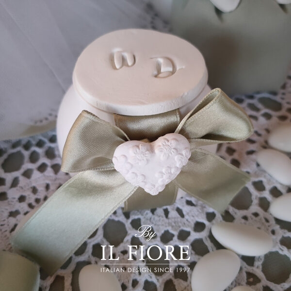 Bomboniera matrimonio, scatola in gesso profumatissimo, oltre ad essere un portagioie ha all’interno anche una candela, decorato con cuoricino.