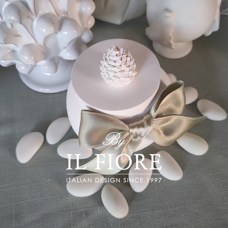 Bomboniera matrimonio, scatola in gesso profumatissimo, oltre ad essere un capiente portagioie ha all’interno anche una candela, decorato con pigna e fiocco verde salvia.