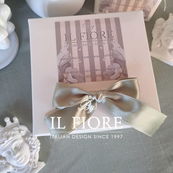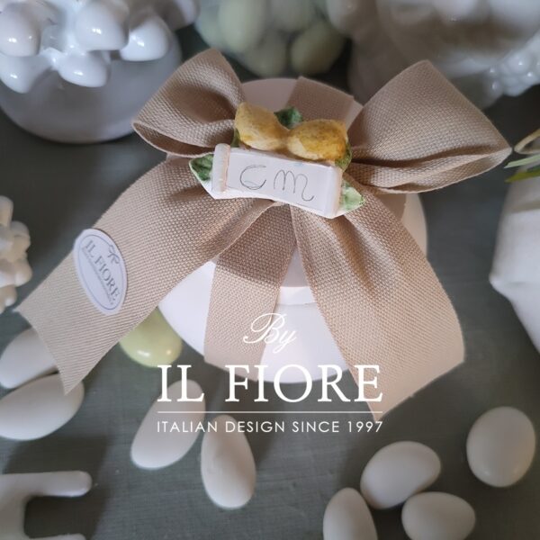 Bomboniera matrimonio, scatola in gesso profumatissimo, oltre ad essere un capiente portagioie ha all’interno anche una candela, decorato con targhetta limoni in gesso profumato, la targhetta si può personalizzare anche con iniziali sposi e fiocco verde salvia.