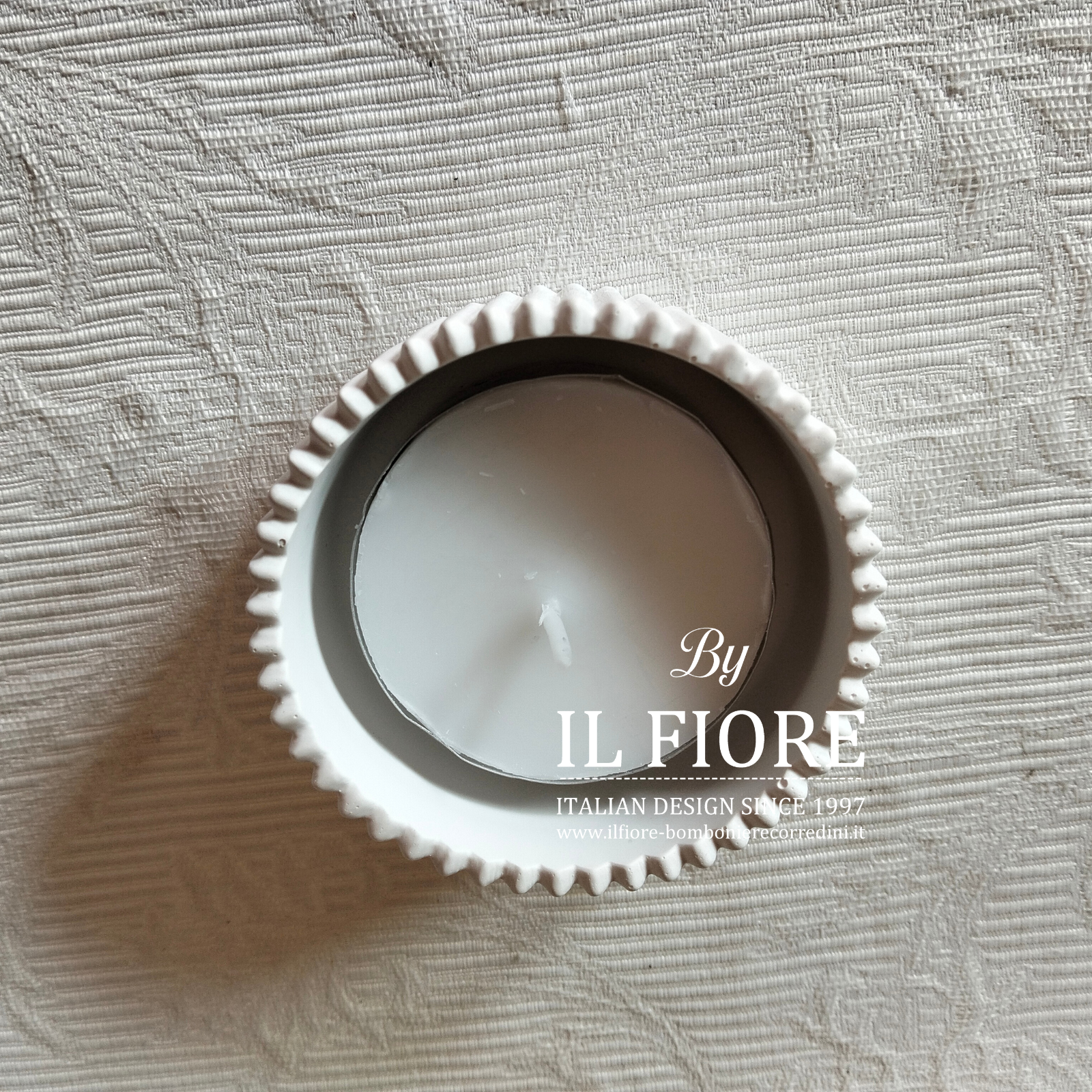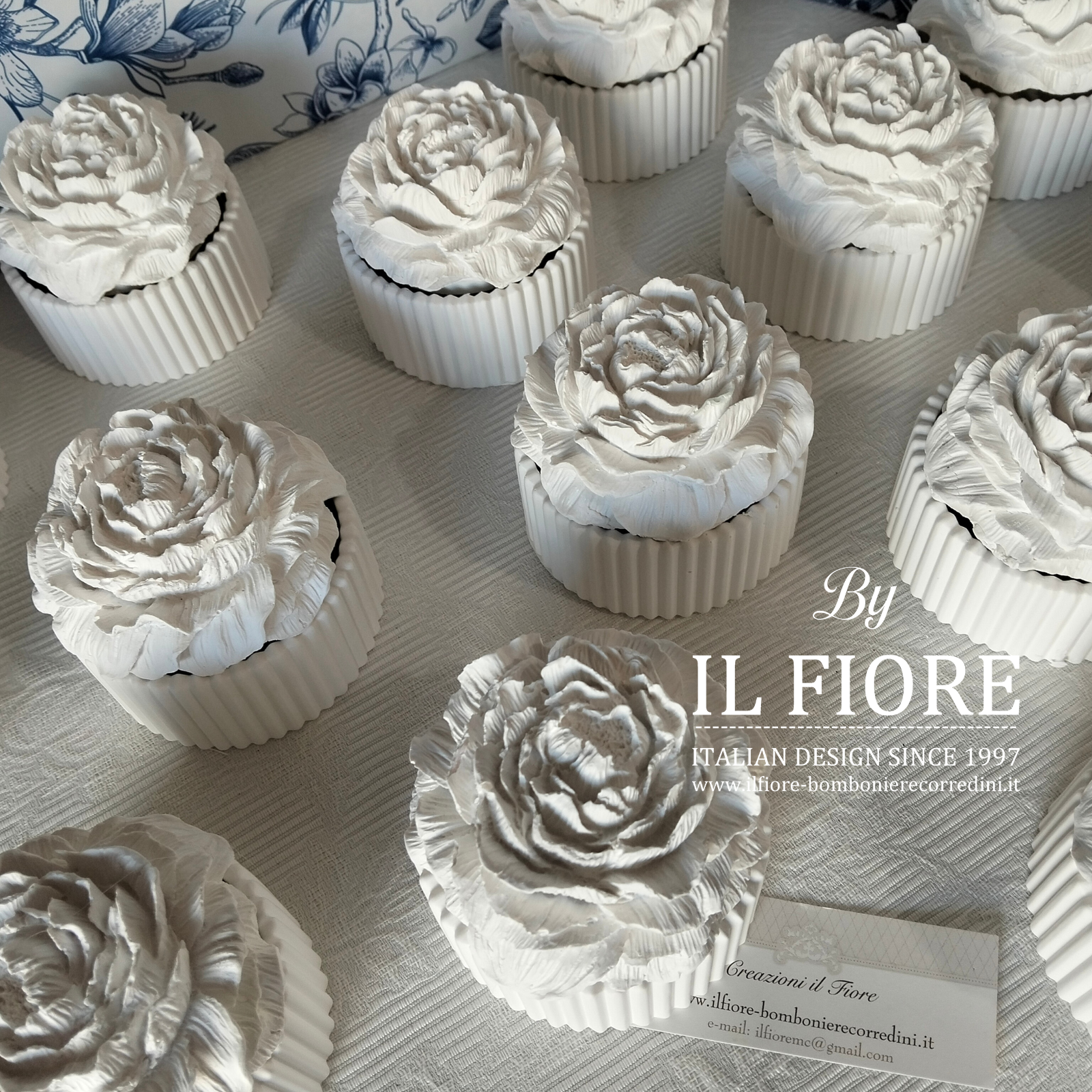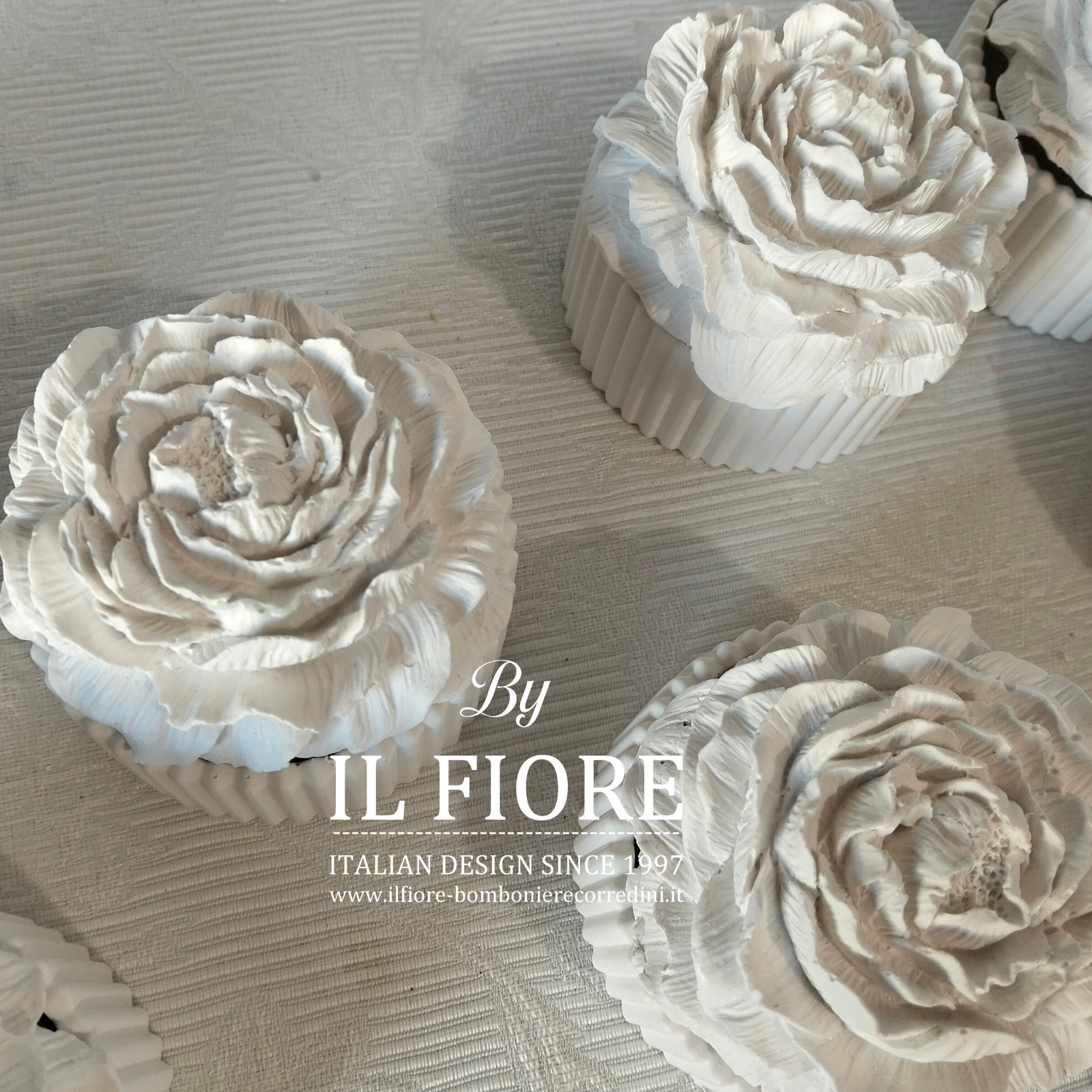La bomboniera è realizzata in gesso profumato, all’interno è inserita una candela in metallo estraibile. La bomboniera peonia è confezionata con scatola e fiocco.