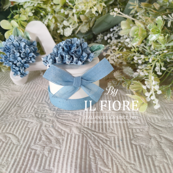 Bomboniere matrimonio scatola portagioie, coperchio decorato con ortensia e candela peonia. Confezionata con scatola e fiocco di raso.