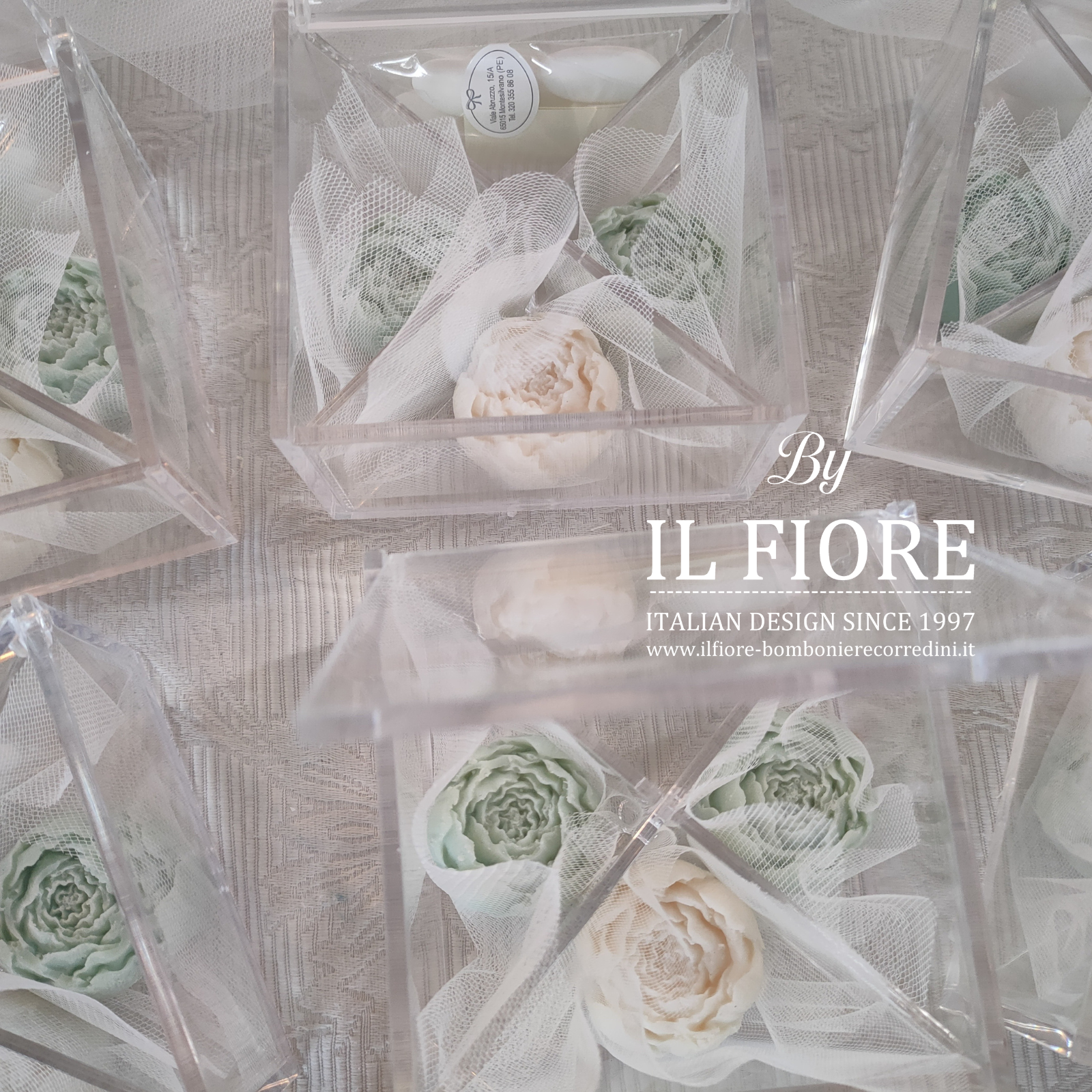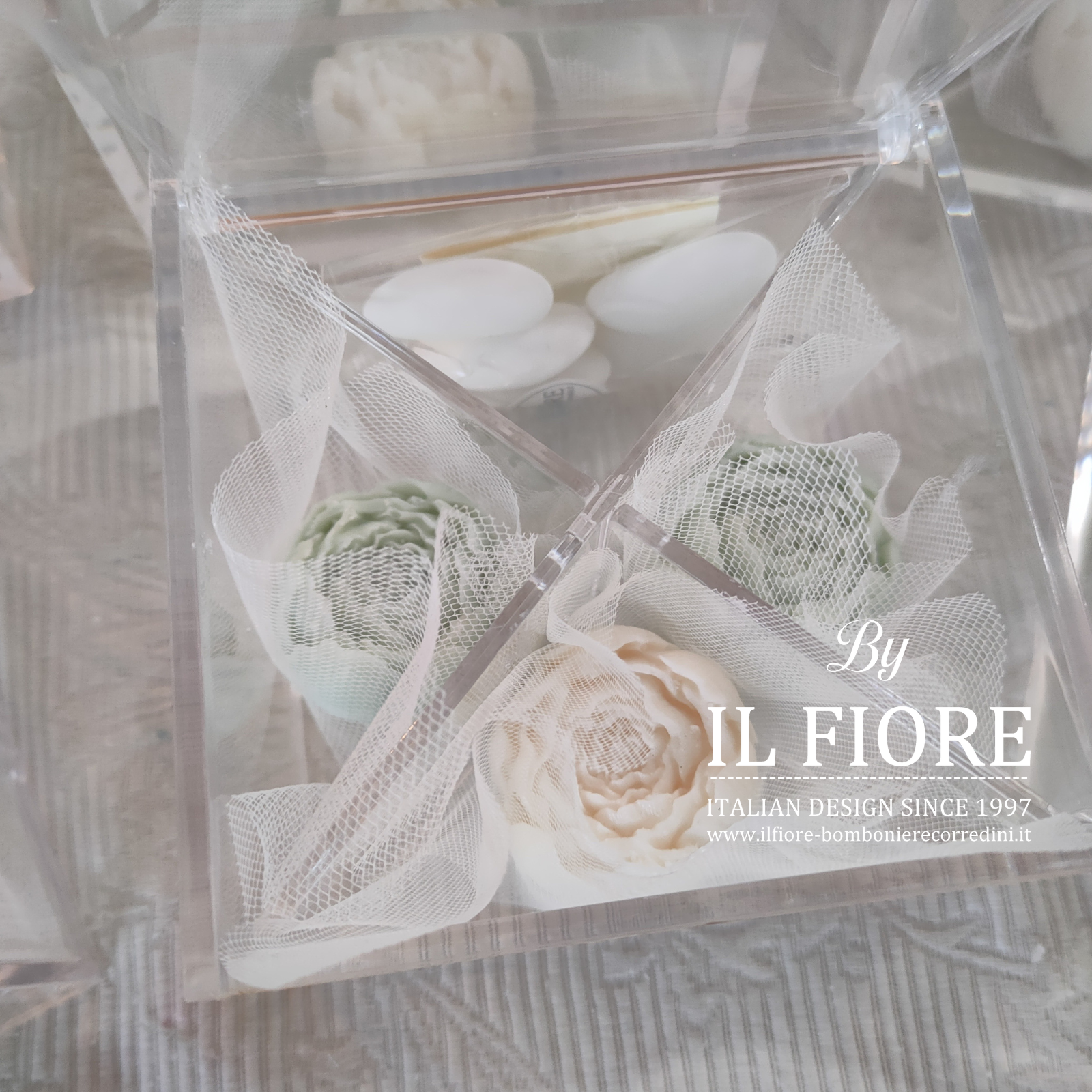 Bomboniera matrimonio scatola portagioie con scomparti, contiene tre candele decorative peonie.