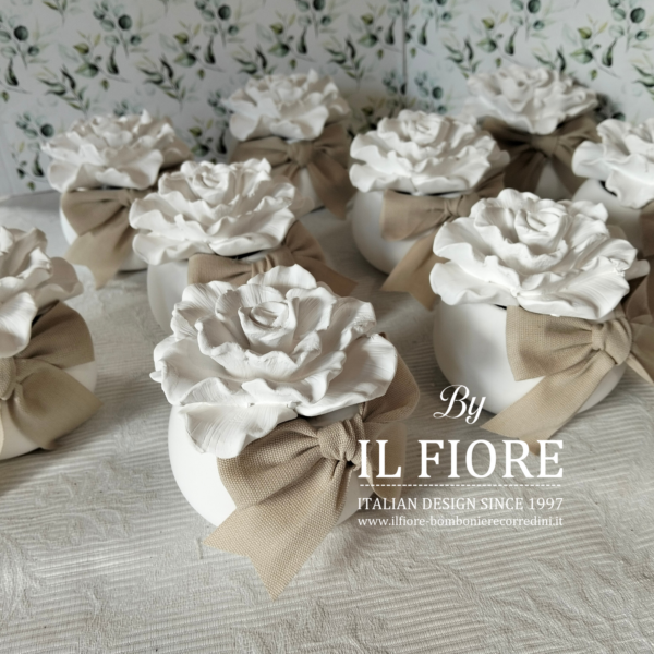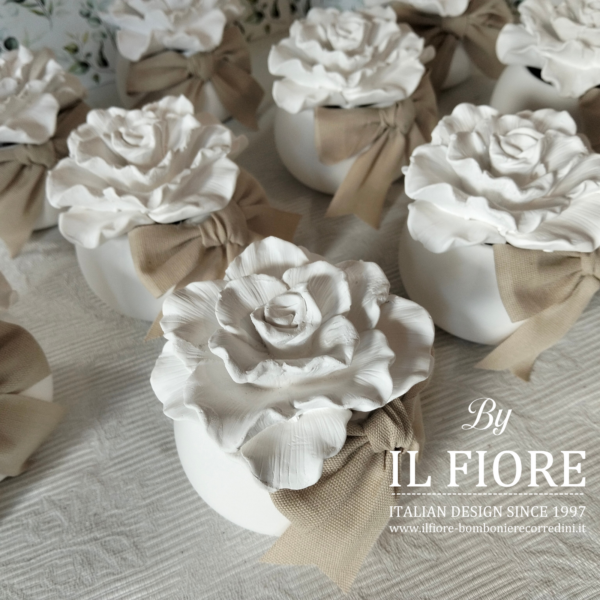 Bomboniera matrimonio scatola portagioie raffinatissima con coperchio a forma di peonia. La bomboniera รจ confezionata con scatola e fiocco.