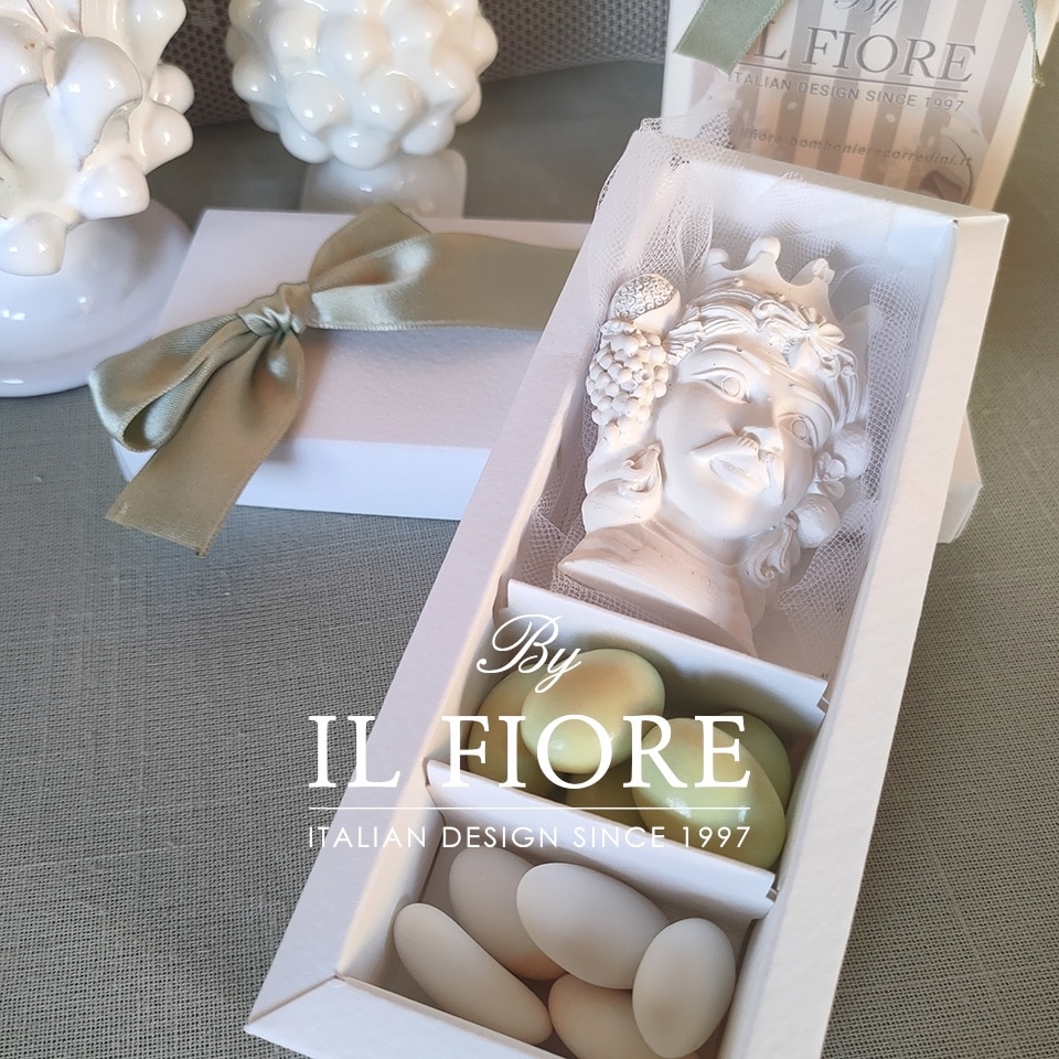 Bomboniera matrimonio, scatola portaconfetti con moro siciliano in gesso con calamita, confetti cioccomandorla al gusto pistacchio e alla mandorla, comprende anche il bigliettino in omaggio.