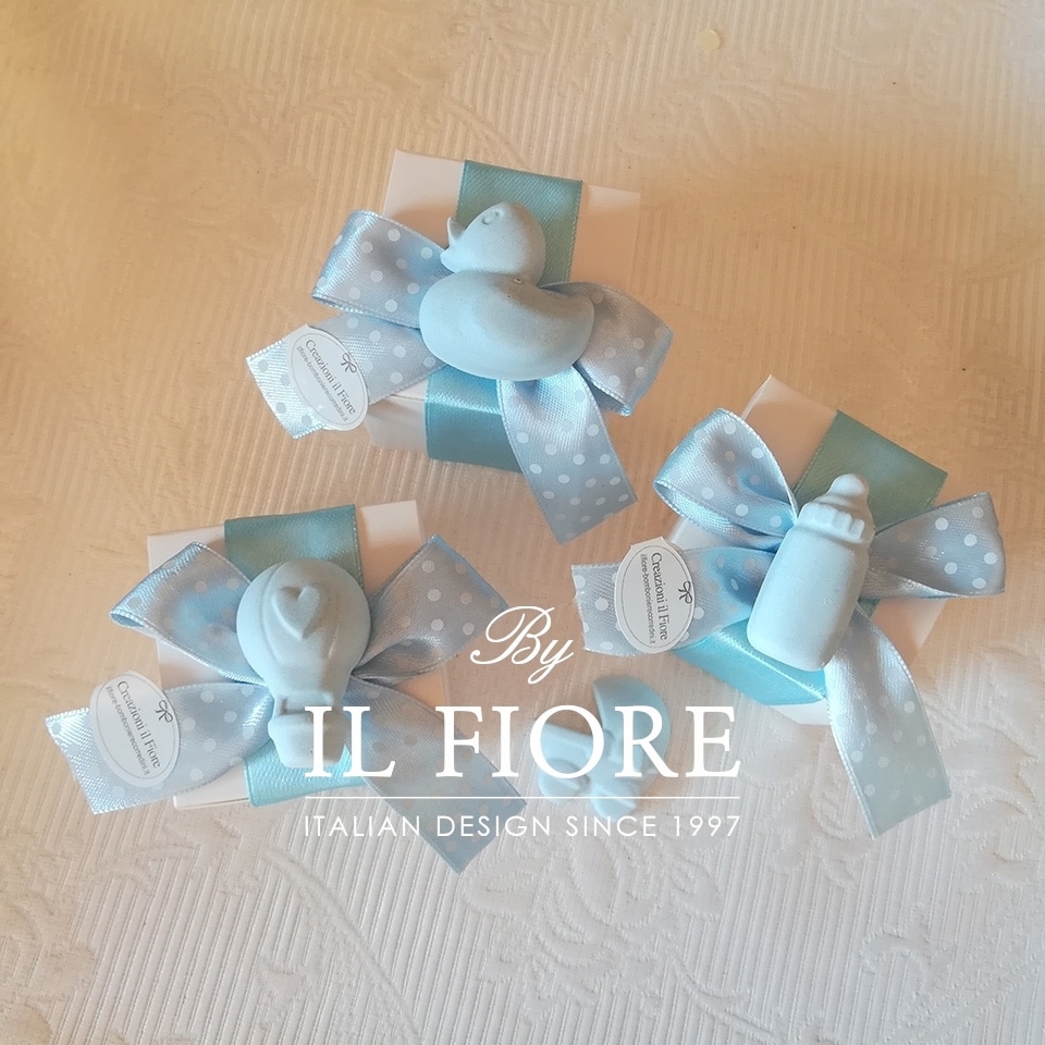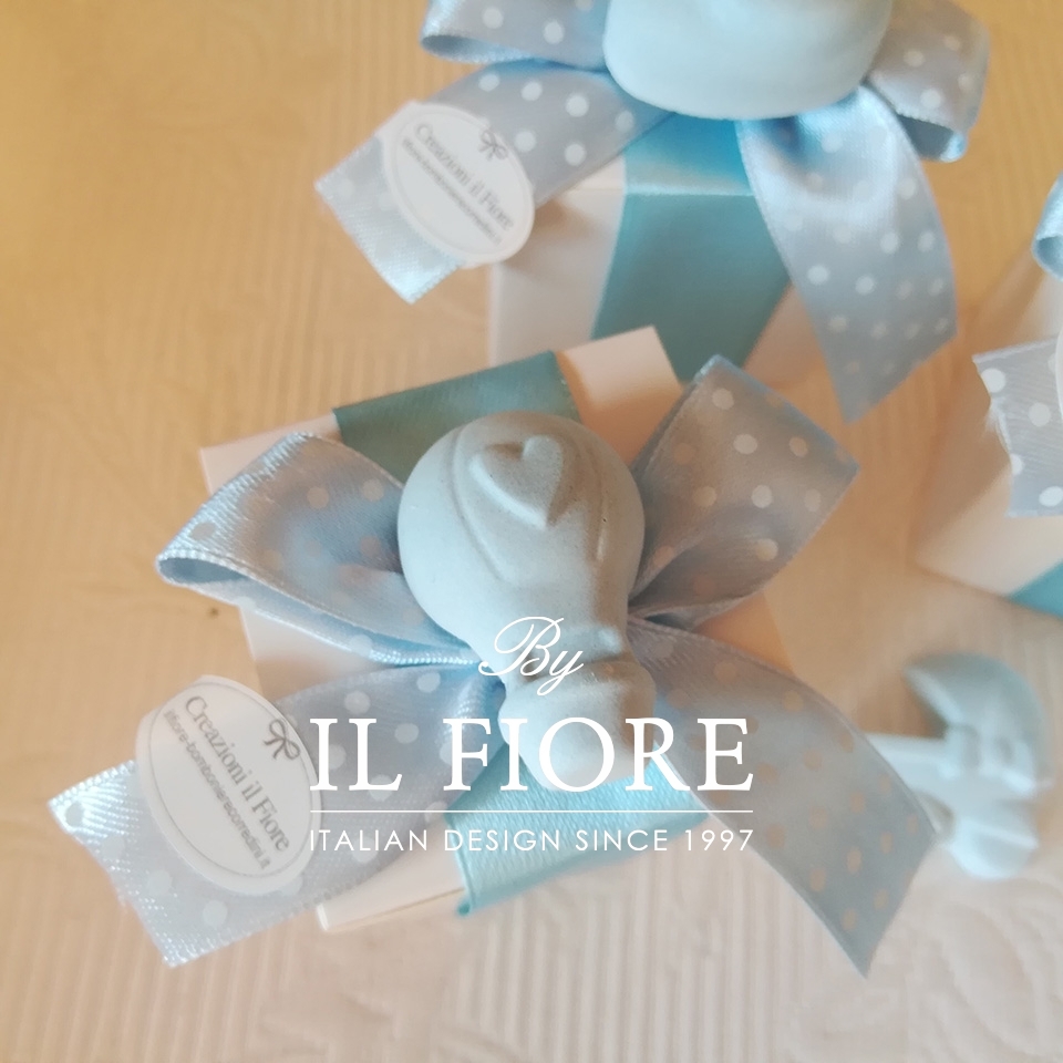 Bomboniera nascita bimbo e bimba, scatola portaconfetti con nastro di raso, fiocco a pois e gessetti profumati colorati celeste o rosa, in quattro modelli mongolfiera, biberon, carrozzina e paperella.