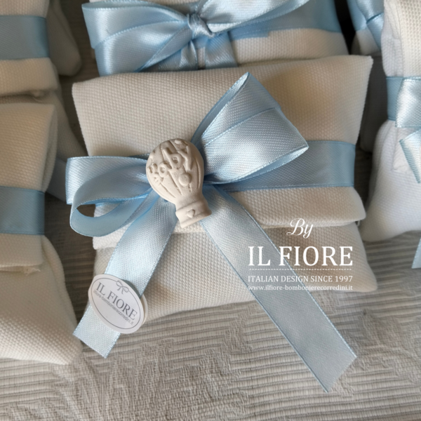 Bomboniera per nascita bimbo bimba, sacchetto bustina con mongolfiera in gesso profumato con fiocco.