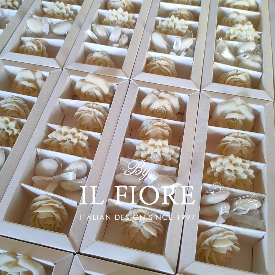 La bomboniera è confezionata con 4 candele, scatola con fiocco, bigliettino in omaggio e  5 confetti alla mandorla.