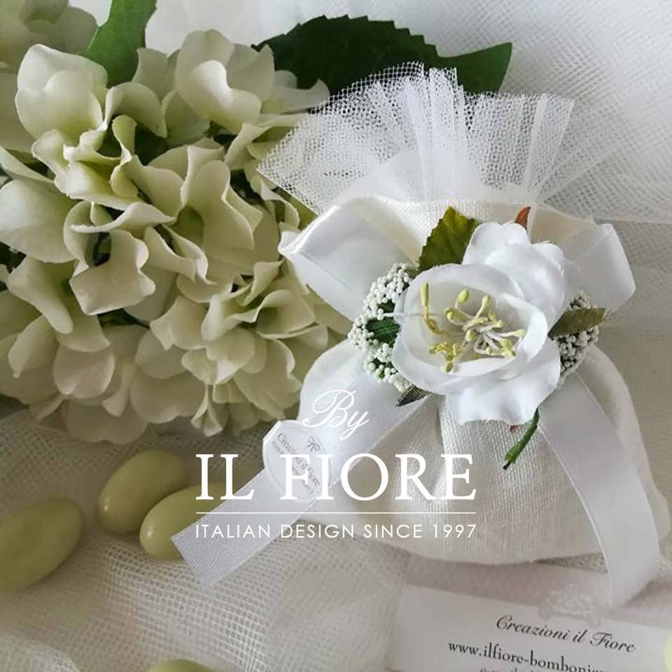Bomboniera nozze argento – oro e Matrimonio, sacchetto classico in lino colore bianco, con fiori Rosa e Gypsophila e nastro di raso.