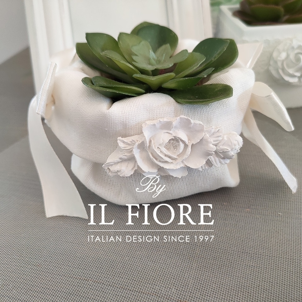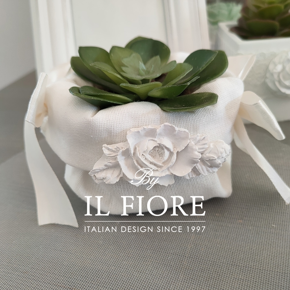 Bomboniera Matrimonio, Comunione, Cresima e anniversario di matrimonio. Bomboniera con piantine grasse VERE e miste. La bomboniera è confezionata con sacchetto decorato con peonia in gesso profumato.