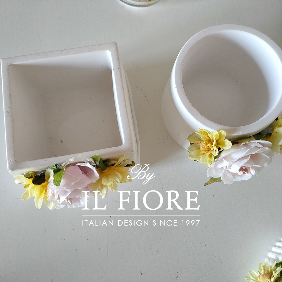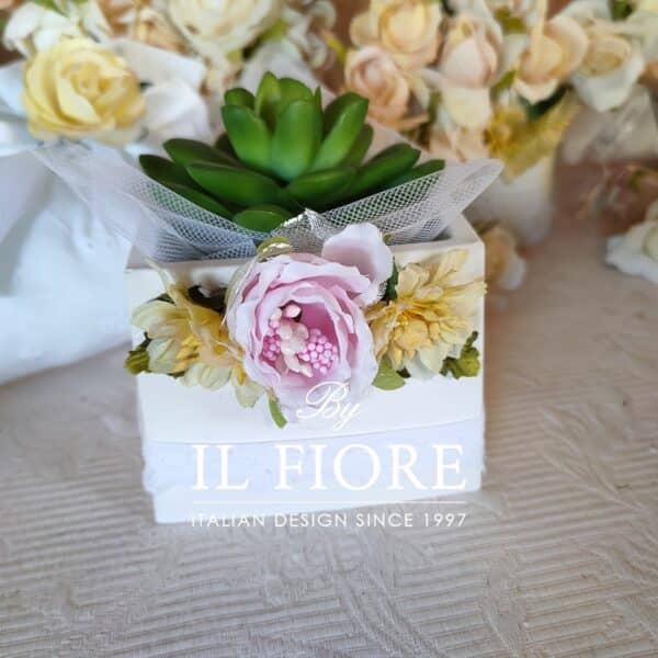 Bomboniera Comunione e Cresima. Bomboniera con piantine grasse VERE e miste. La bomboniera è confezionata con vasetto in gesso bianco di forma quadrata e tonda decorati con fiori e Sangallo.