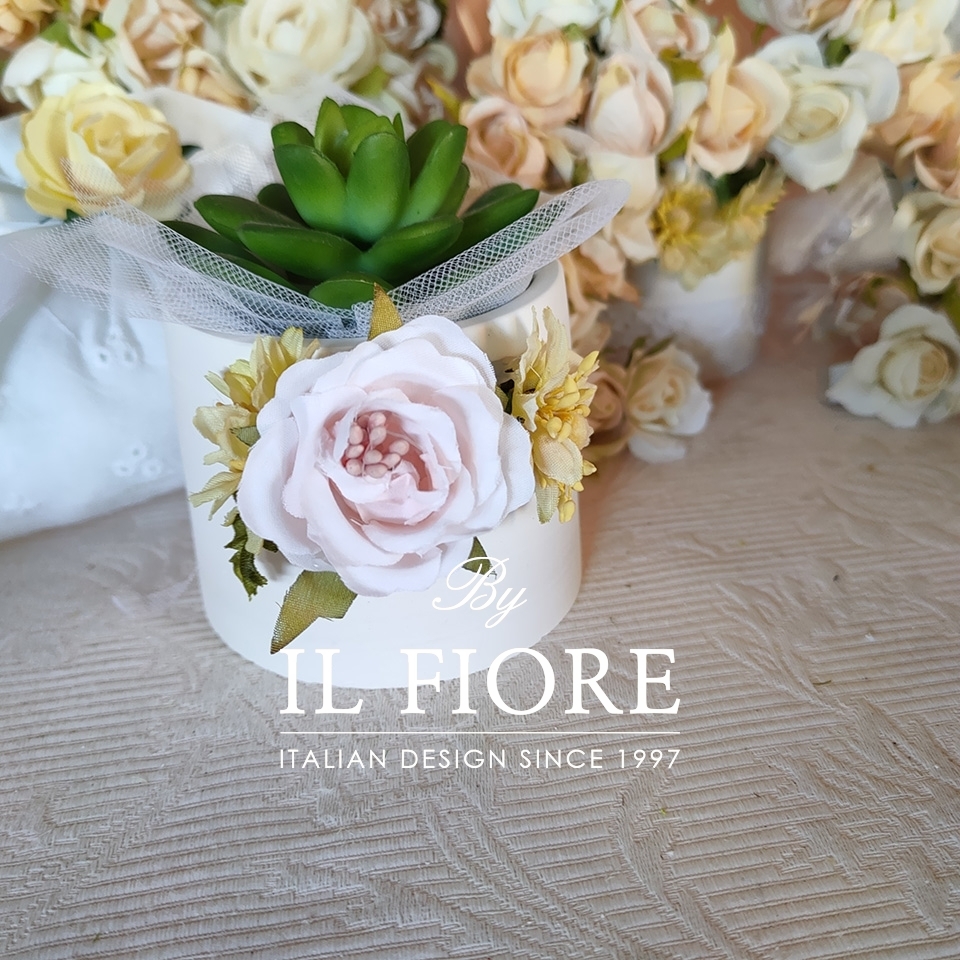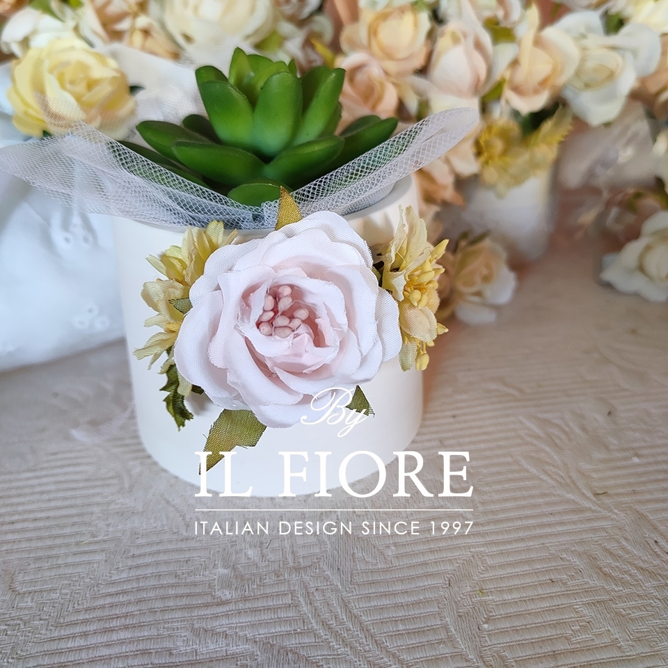 Bomboniere Comunione piantina grassa con vasetti in gesso con fiori e Sangallo