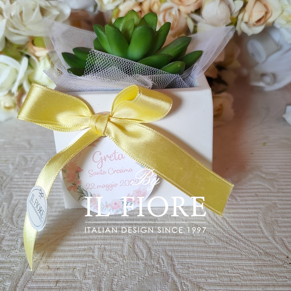 Bomboniera Comunione e Cresima. Bomboniera con piantine grasse VERE e miste. La bomboniera è confezionata con vasetto in gesso bianco di forma quadrata e tonda decorati con fiocco e tag.