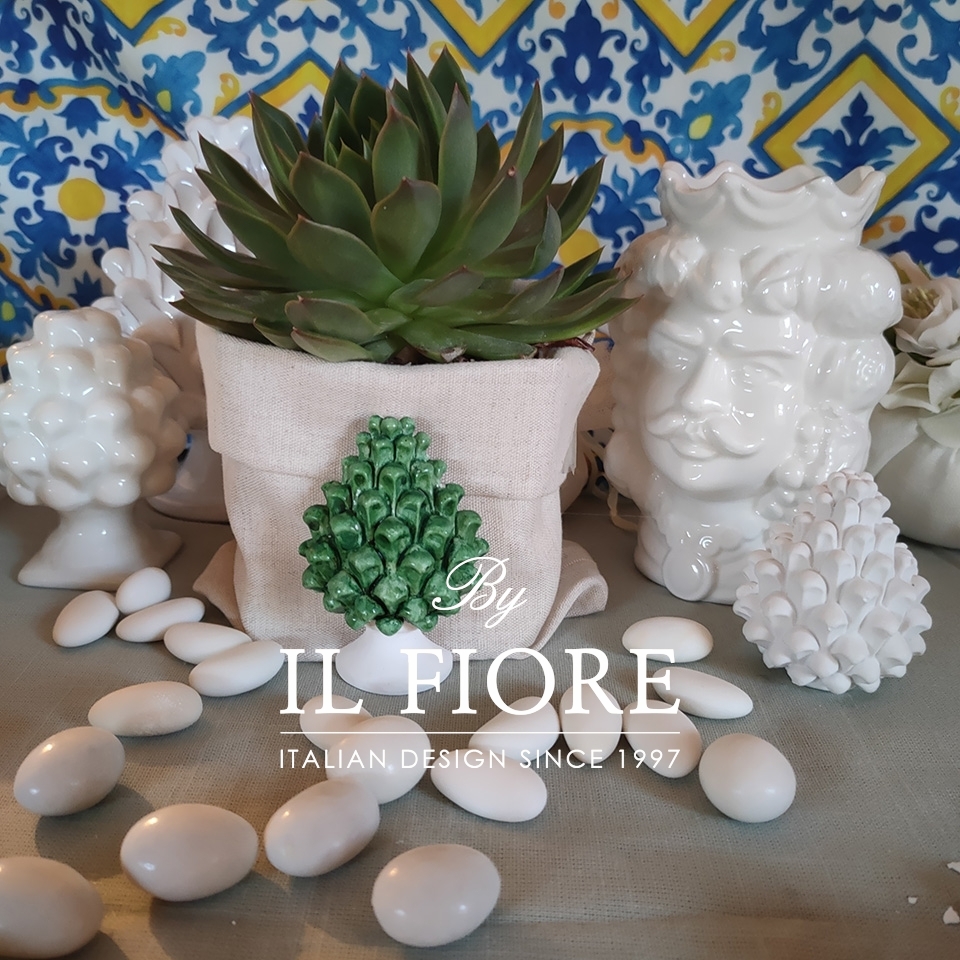 La bomboniera è confezionata con scatola e sacchetto ecru decorata con pigna siciliana verde.
