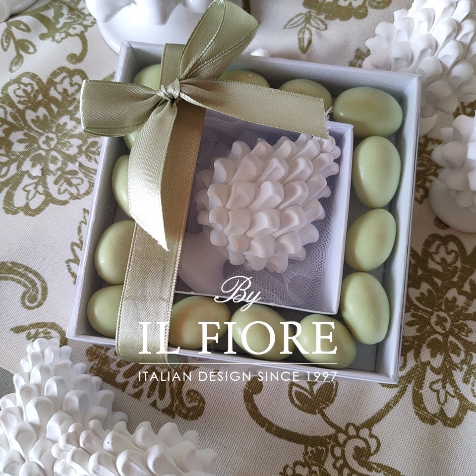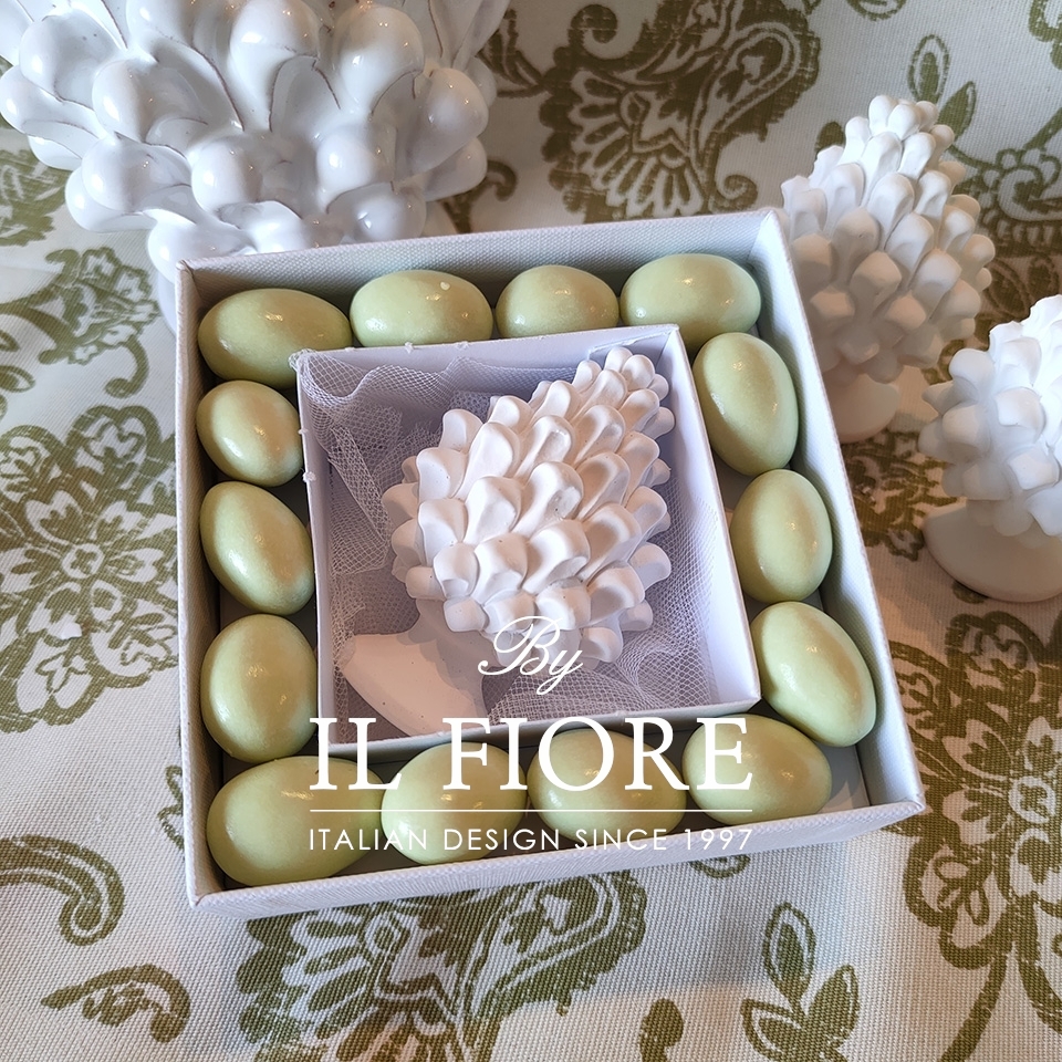 Bomboniera matrimonio, scatola portaconfetti quadrata con pigna siciliana in gesso, confetti cioccomandorla al gusto pistacchio e bigliettino in omaggio.