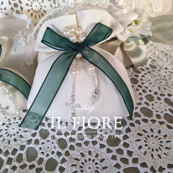 Bomboniera Comunione e Cresima sacchetto portaconfetti con elegantissimo rosario a braccialetto con perle