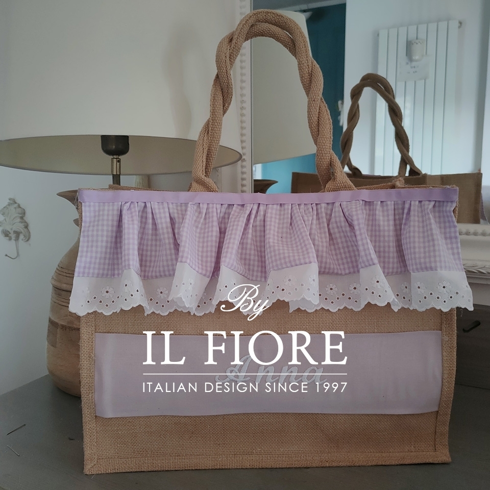 Borsa in juta naturale con manici in juta, decorata con raffinatissimo pizzo Sangallo e cotone fantasia a quadretti di colore glicine, personalizzabile con nome e borsello, il tutto realizzato a mano. Un accessorio unico da indossare in città o al mare di giorno o nelle serate estive. Ideale come originalissima e personalizzata idea regalo. Bag donna juta
