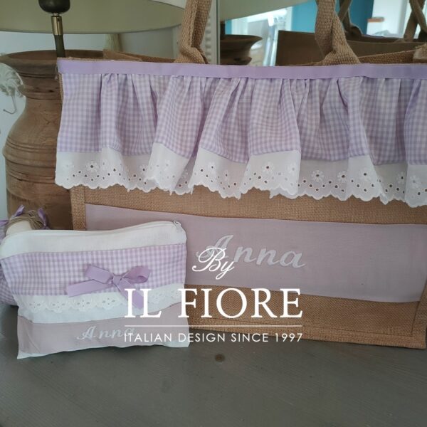 Borsa in juta naturale con manici in juta, decorata con raffinatissimo pizzo Sangallo e cotone fantasia a quadretti di colore glicine, personalizzabile con nome e borsello, il tutto realizzato a mano. Un accessorio unico da indossare in città o al mare di giorno o nelle serate estive. Ideale come originalissima e personalizzata idea regalo. Bag donna juta