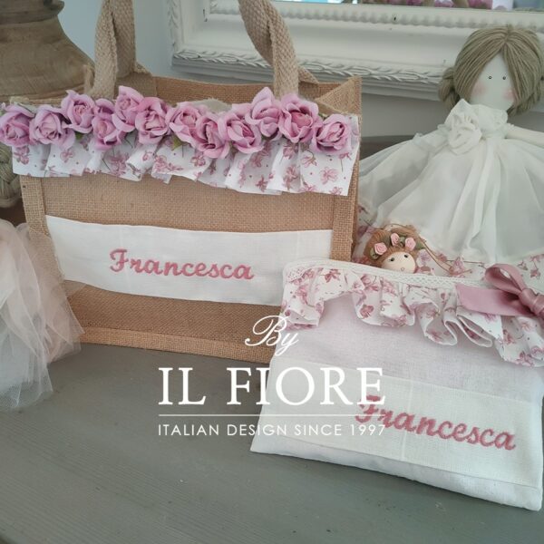 Borsa in juta naturale con manici in juta, decorata con tessuto e fiori  personalizzabile con nome e borsello, il tutto realizzato a mano. Un accessorio unico da indossare in città o al mare di giorno o nelle serate estive. Ideale come originalissima e personalizzata idea regalo. Bag donna juta