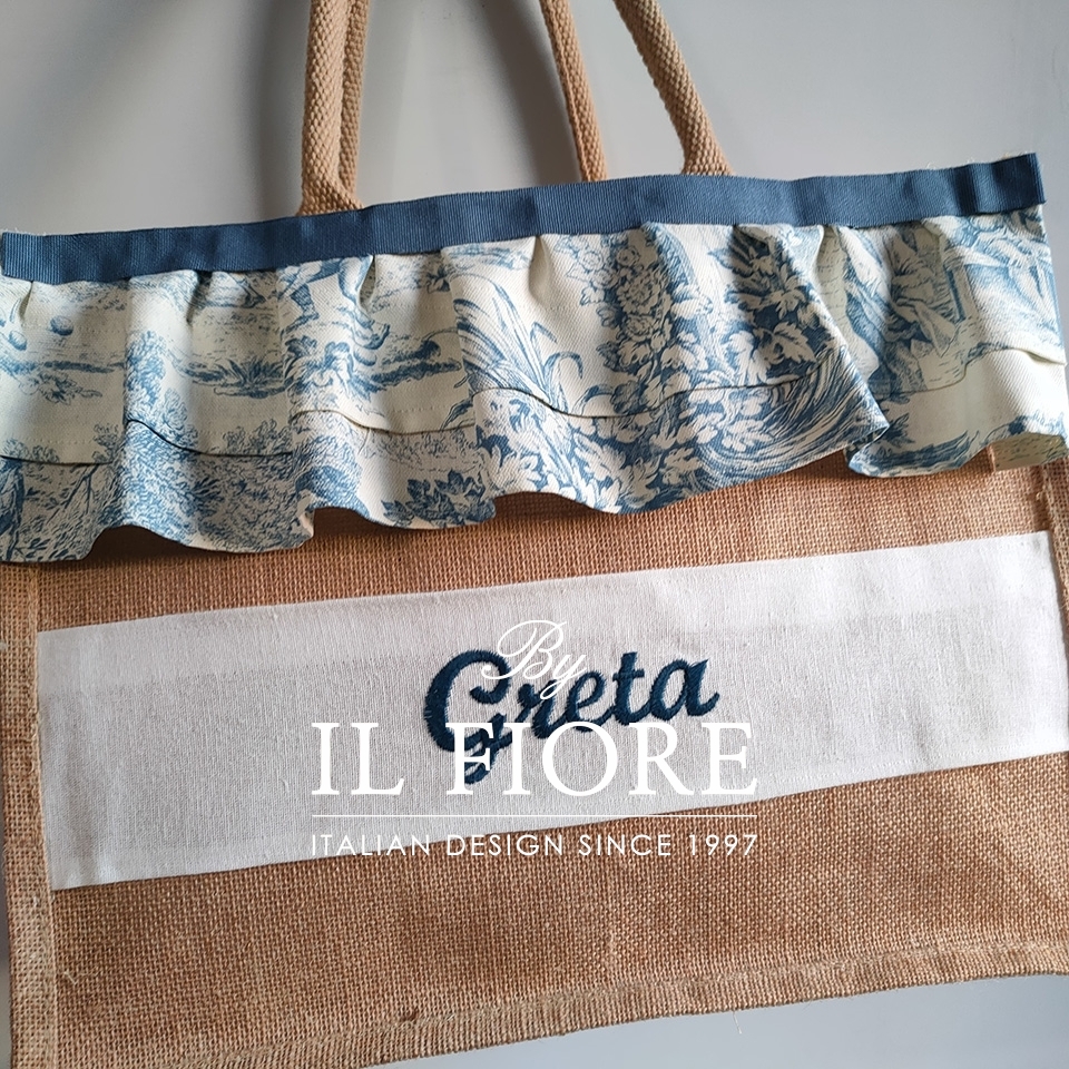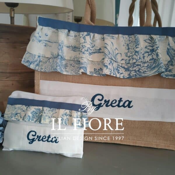 Borsa in juta naturale con manici in juta, decorata con raffinatissimo tessuto francese Toile de Jouy , personalizzabile con nome e borsello, il tutto realizzato a mano. Un accessorio unico da indossare in città o al mare di giorno o nelle serate estive. Ideale come originalissima e personalizzata idea regalo. Bag donna juta