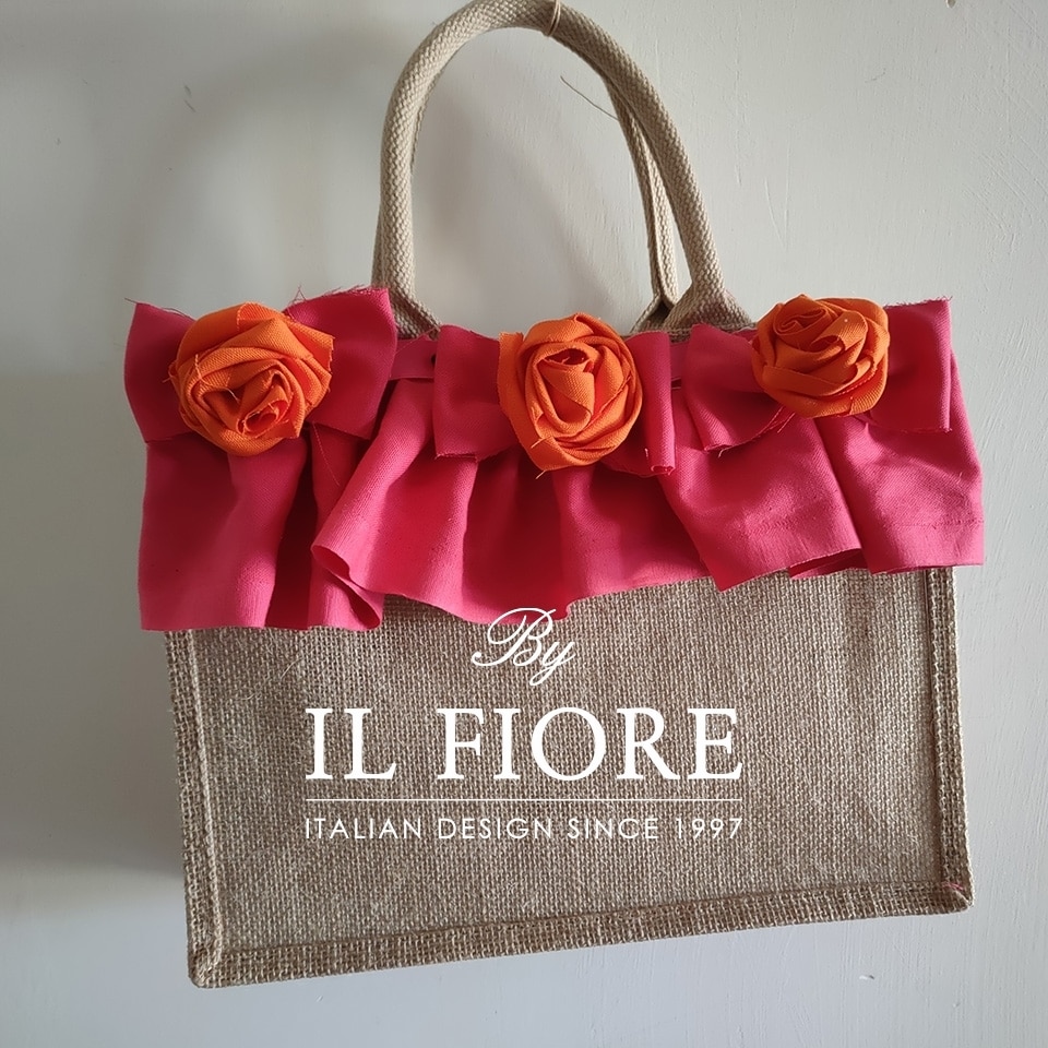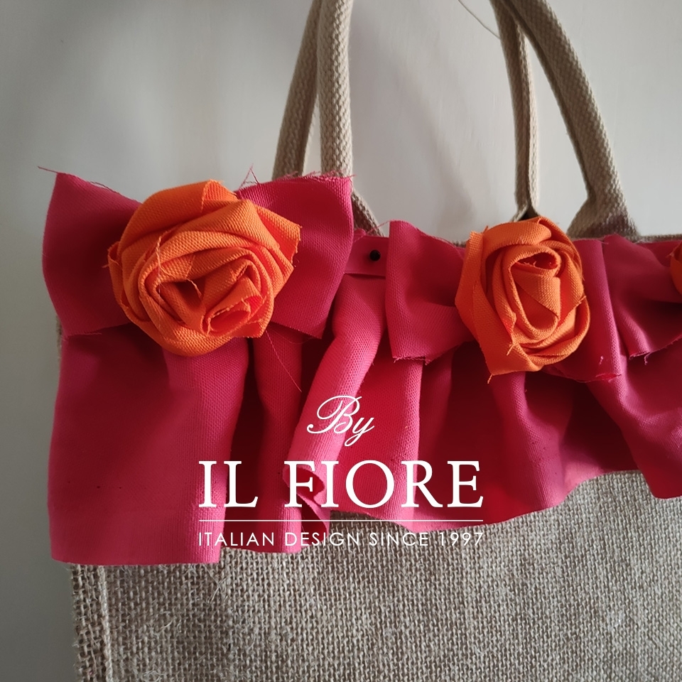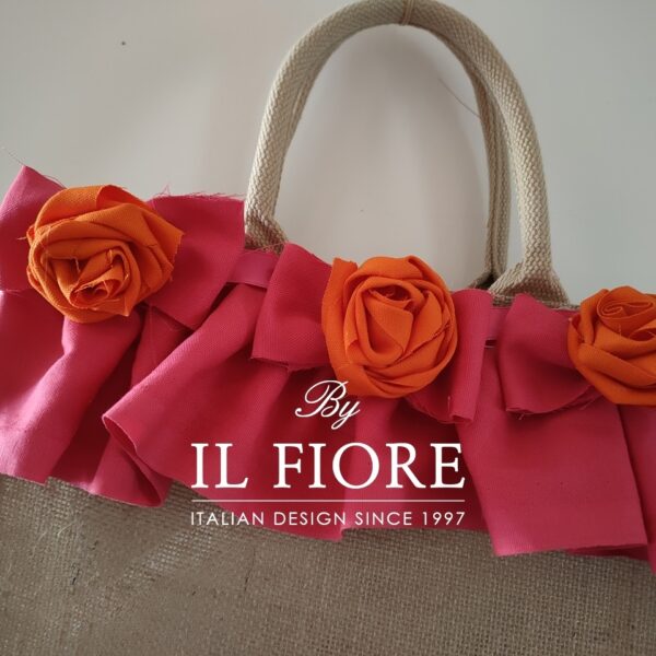 Borsa donna in juta, decorata con raffinatissimi fiocchi e fiori di stoffa con volant fucsia, il tutto realizzato a mano. Un accessorio unico da indossare in città o al mare di giorno o nelle serate estive. Ideale come originalissima e personalizzata idea regalo! Nel prezzo è compresa anche la confezione regalo. Bag donna juta. N.B. Solo ed esclusivamente per gli articoli da regalo comprese le borse la spedizione è di € 5,00.